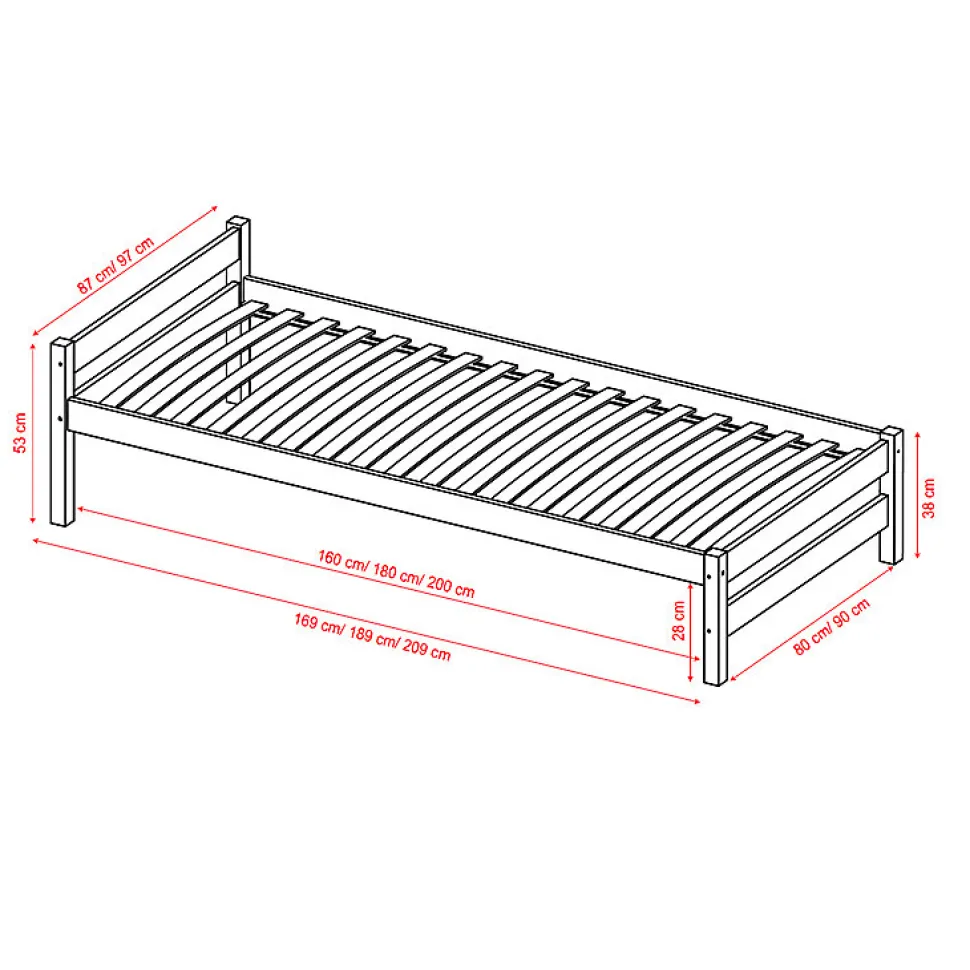 - Lit : Sommier à lattes inclus – Poids maximum recommandé : 100 kg – Hauteur conseillée pour le matelas : à partir de 8 cm vendu séparément – Hauteur sous le lit : 28 cm
