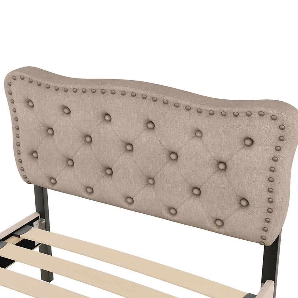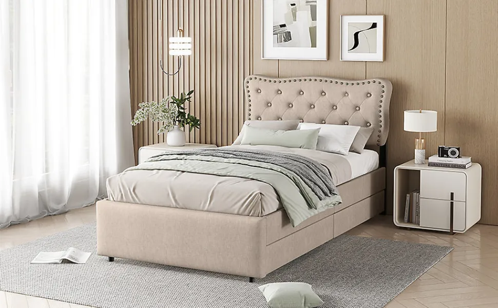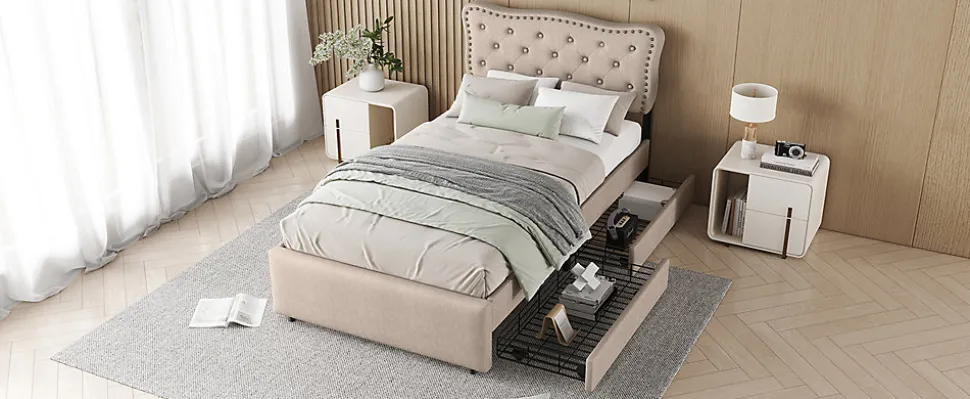 Ce lit beige foncé est la parfaite combinaison d’élégance et de confort ! Il offre un aspect exquis tout en étant pratique pour votre chambre. Avec ses clous décoratifs sur la tête de lit, il ajoutera de l’élégance à votre chambre. Deux tiroirs de rangement facilitent l’organisation et le rangement de vos affaires, contribuant ainsi à un espace propre et ordonné.Caractéristiques principales :Matériaux durables : Fabriqué en MDF et en tissu en lin, ce lit est à la fois élégant et solide, offrant une longue durée de vie.Design épuré : Le lit a une couleur beige foncé qui se marie parfaitement avec de nombreux styles de décoration, apportant une touche sophistiquée à la chambre.Clous décoratifs : La tête de lit est recouverte de tissu, ornée de boutons de la même couleur et de clous décoratifs en cuivre, ajoutant une touche de raffinement.Hauteur réglable de la tête de lit : La hauteur de la tête de lit peut être ajustée à 101,5 cm, 106,5 cm et 111,5 cm, ce qui permet d’adapter le lit à des matelas de 15 à 25 cm.Rangement : Deux tiroirs sous le lit offrent un espace de rangement supplémentaire pour organiser et stocker vos affaires.Dimensions :Dimensions du produit : 203 x 90 x 111.5 cmDimensions du matelas : 90 x 200 cmHauteur totale : 111.5 cmPoids maximal supporté : 200 kgNombre de lattes : 12Recommandation pour l’épaisseur du matelas : 15-25 cmMontage requis : OuiOrigine : Chine