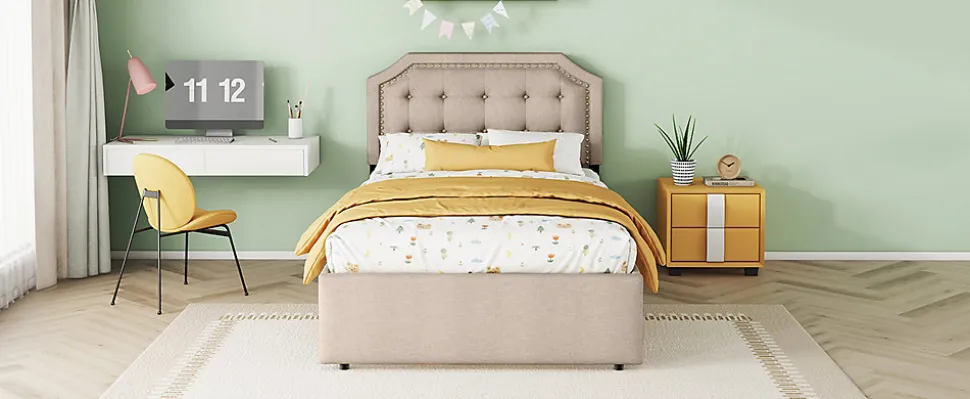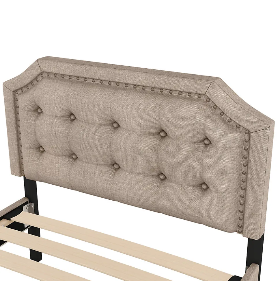 Ce lit beige foncé est l’option idéale pour apporter une touche d’élégance et de confort à votre chambre. Le design simple et sophistiqué, associé à des fonctions pratiques, en fait un excellent choix pour votre espace de vie.Caractéristiques principales :Matériaux durables : Fabriqué en MDF et tissu en lin, ce lit est solide et durable, assurant une longue durée de vie.Design élégant : Sa couleur beige foncé est à la fois classique et moderne, idéale pour divers styles de décoration intérieure.Clous décoratifs : La tête de lit est ornée de clous décoratifs en cuivre, apportant un effet raffiné et élégant à la chambre.Hauteur ajustable : La hauteur de la tête de lit peut être réglée à 101,5 cm, 106,5 cm et 111,5 cm, ce qui permet de s’adapter à différents types de matelas.Rangement fonctionnel : Deux tiroirs sous le lit pour organiser vos affaires et garder votre chambre bien rangée.Dimensions :Dimensions du produit : 203 x 90 x 111.5 cmDimensions du matelas : 90 x 200 cmHauteur totale : 111.5 cmPoids maximal supporté : 200 kgNombre de lattes : 12Recommandation pour l’épaisseur du matelas : 15-25 cmMontage requis : OuiOrigine : Chine