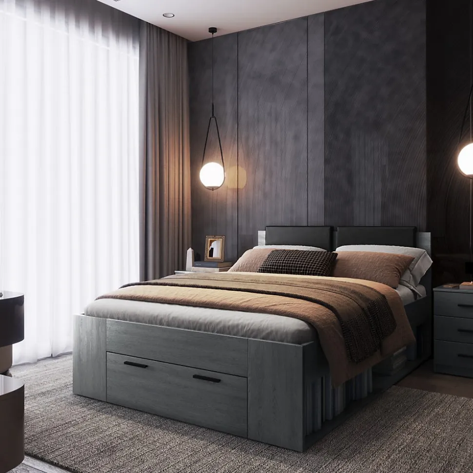 Lit adulte 140×200 avec tiroirs intégrés. Couleur gris effet bois collection FLOYDCe lit 2 places de la collection FLOYD fera de votre chambre un véritable cocon, vous permettant de vous détendre et de vous reposer. N’attendez plus, il apportera immédiatement confort et élégance à votre chambre grâce à sa forme design.- COMPOSITION : Lit + tête de lit + tiroirs- DIMENSIONS : Lit + tête de lit : largeur 146 x Longueur 205 x Hauteur 101cm. (Couchage 140×200 cm)- COLORIS : Gris effet bois.- STRUCTURE: Panneaux de particules et MDF de première qualité.- CARACTÉRISTIQUES : Lit 140×200 avec tiroirs intégrés.*** SOMMIER NON INCLUS ***Lit disponible dans plusieurs dimensions et différents coloris. Retrouvez également le reste de la collection FLOYD dans notre boutique : Armoire, commodes, ensemble de chambre complet…