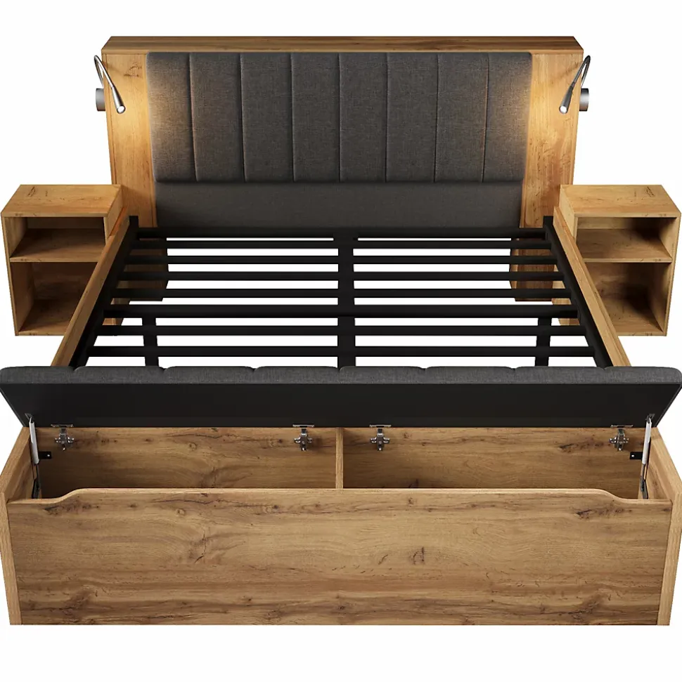 •【Lampes de lecture intégrées et ports USB】Des lampes de lecture réglables sont situées de chaque côté de la tête de lit. Les boutons ronds des supports de lampe permettent de régler la luminosité, et une pression prolongée offre un réglage continu. Les supports de lampe intègrent également des ports de chargement USB pour recharger facilement smartphones et autres appareils électroniques.•【Tables de chevet + Banc de lit】Deux tables de chevet avec compartiments de rangement peuvent être placées de chaque côté de la tête de lit, offrant ainsi un espace de rangement ouvert. Le banc de lit est équipé d’un vérin à gaz pour une ouverture et une fermeture faciles. Ses multiples compartiments internes permettent de ranger couvertures, vêtements de saison et petits objets de manière organisée. La position du banc est réglable.•【Esthétique naturelle et confort optimal】Ce produit présente une finition bois chaleureuse, affichant une esthétique simple et naturelle. La tête de lit est dotée d’un dossier en lin pliable et confortable, qui peut être ouvert pour le rangement et rabattu pour servir de dossier. Le cadre de lit, de conception ouverte, est facile à nettoyer avec un aspirateur robot, et un espace de rangement supplémentaire est prévu sous le lit.•【Structure robuste en fer】Un cadre en fer de haute qualité assure la stabilité et la durabilité du sommier. La conception encastrée du matelas empêche efficacement ce dernier de glisser, assurant un soutien ferme et garantissant votre confort et votre sécurité pendant votre sommeil.•【Facile à assembler】Des instructions détaillées et des pièces complètes sont disponibles pour vous aider à réaliser l’assemblage rapidement.