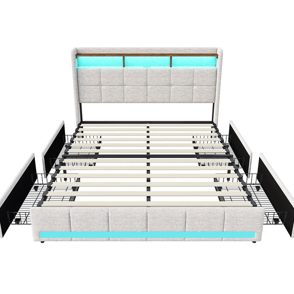✦ Description du produit● Tête de lit intelligente : Design minimaliste moderne intégrant deux prises EU et deux ports USB pour un chargement pratique de vos appareils (téléphone, tablette, liseuse). Idéal pour travailler, lire ou se détendre au lit tout en gardant vos équipements toujours alimentés.● Éclairage LED personnalisable : Système LED intégré contrôlable via télécommande. Ajustez facilement couleur et luminosité pour créer l’ambiance parfaite : lumière douce pour la détente ou éclairage plus vif pour la lecture. Une solution moderne qui améliore le confort et l’esthétique de votre chambre.● Grand espace de rangement : Le cadre de lit dispose de 2 tiroirs spacieux situés sur les deux côtés. Montés sur roulettes, ils s’ouvrent et se ferment en douceur. Chaque tiroir possède un loquet pour éviter tout glissement accidentel. Parfait pour organiser linge de lit, vêtements ou accessoires et garder un espace toujours propre.● Élégance & robustesse : Structure en fer haute résistance supportant jusqu’à 350 kg, renforcée par des pieds supplémentaires au centre pour une stabilité optimale. Un lit durable, confortable et visuellement harmonieux.✦Détails du produit :- Matériau : Bois + Métal + Lin.- Dimensions (l x p x h) : 218 × 183.5 × 112 cm- Poids total du produit : 54.6 kg- Charge maximale : 350 kg.- Surface de couchage de 160 x 200 cm (sans matelas).- Distance tête de lit : 25 cm- Couleur : beige/gris- Nombre de lamelles : 12- Type de sommier : comprend un sommier à lattes.- Outils supplémentaires nécessaires : tous les outils inclus / tournevis – Nombre de colis : 2✦ Remarques :1. Les mesures étant prises à la main, il peut y avoir des erreurs raisonnables.2. Le lit est expédié en 2 colis et peut ne pas arriver en même temps, soyez patient.