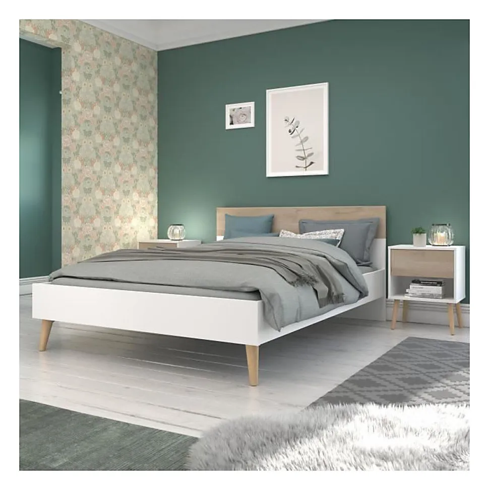 Lit adulte AALBORG 140 x 190 cm au style scandinave, structure en panneaux de particules 22 mm avec finition papier décor blanc et chêne, pieds coniques en bois massif, design minimaliste deux tons, montage en kit, sommier et matelas non inclus, garantie pièces 2 ans.