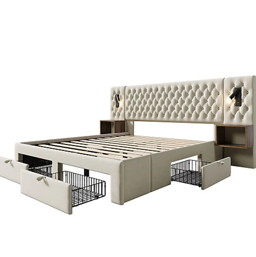 •【Design vintage de haute qualité】Le tissu en velours beige classique est doux et confortable, et la collision visuelle avec la tête de lit en grain de bois met en valeur le goût unique du rétro haut de gamme.•【Grand espace de rangement】Il y a deux tables de chevet en bois d’une capacité de charge de 25 kg, qui peuvent facilement ranger les objets fréquemment utilisés. Il y a quatre tiroirs de grande capacité (59*38*14 cm), deux au bout du lit et un de chaque côté du lit. Ils sont dotés de sangles coulissantes pour un retrait facile, vous permettant d’organiser la literie. la majeure partie de la chambre.•【Éclairage chaleureux】Des lampes de lecture sont installées sur les côtés gauche et droit du lit, offrant un éclairage doux la nuit. Equipé d’un port de chargement USB, vous pouvez charger vos appareils électroniques. Créez un environnement confortable et douillet pour lire avant de vous coucher.•【Système de support stable】Le cadre de lit est fait de métal peint robuste et peut supporter jusqu’à 800 livres. Le cadre est encastré et la tête de lit est dotée de languettes latérales plus larges pour empêcher le matelas de basculer. Le tuyau en fer avec bandes silencieuses en EVA peut réduire les problèmes de bruit lors d’une utilisation quotidienne et offrir une expérience de sommeil plus silencieuse.