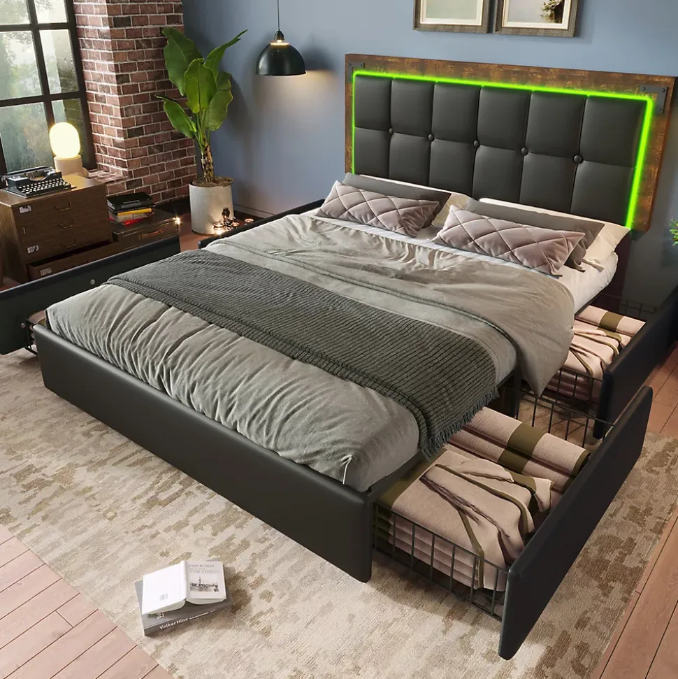Dimensions totales :207×147.5×92-102 cm (LxlxH)Capacité de charge :300KG/660LBSCouleur :noirMatériau :PUSurface de couchage :140×200 cmNombre de paquets : 2Poids net (kg) : 47.20kgMontage nécessaire : OuiMatelas inclus : NonÉclairage LED – Design élégant :Alors que le revêtement de la tête de lit est élégamment divisé par un matelassage élégant, le pied et la tête de lit sont recouverts d’un similicuir de luxe de haute qualité, qui est disponible en trois tailles. L’éclairage LED ajoute un style moderne à votre chambre à coucher. Grâce à la télécommande, vous pouvez changer les différentes couleurs et la luminosité pour un couchage confortable.Tête de lit réglable :La tête de lit rembourrée est remplie d’une éponge plus épaisse de haute densité, de sorte que vous pouvez vous détendre confortablement tout en vous appuyant.La hauteur de la tête de lit est réglable, et la plage de réglage de la hauteur est d’environ 10 cm de différence.Rangement :Le lit est équipé de 4 tiroirs de grande capacité. Les deux côtés du lit sont équipés de boucles de tiroir qui permettent de fixer fermement le tiroir au lit lorsqu’il n’est pas utilisé, afin de garder votre chambre à coucher bien rangée. Les boîtes de rangement sont faciles à sortir et à rentrer grâce aux roulettes de la base. Vous pouvez également retirer le tiroir et ranger de gros objets sous le lit.Qualité durable :Les matériaux souples du lit procurent non seulement une sensation de confort, mais réduisent aussi efficacement les dommages causés par les coins et les arêtes vives que vous ou votre famille risquez de subir à l’usage.Assemblage rapide et facile :Pour réduire le risque de dommages, ce cadre de lit est expédié en 2 boîtes et elles peuvent arriver à des jours différents.