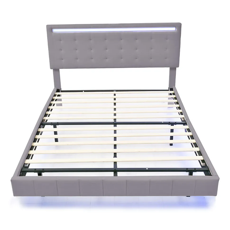 Dimensions totales :210x140x100-105cm(LxLxH)Capacité de charge :250 kgCouleur :grisMatériau :Panneau composite de fibres de bois à densité + métal + tissu de linSurface de couchage :140x200cmNombre de paquets :2Poids net :40.00 kgMontage nécessaire : OuiMatelas inclus : NonDesign avec pieds de lit cachés :Ce lit cache le sommier, qui est fermement soutenu par le pied du lit et soutient efficacement le corps du lit. Au premier coup d’œil, on a l’impression de flotter dans les airs, ce qui offre une expérience visuelle unique et inédite et permet de profiter de la sensation de rêve et de légèreté des nuages.Tissu en lin doux et respirant :Le tissu en lin est lisse et non rugueux, confortable et respirant, de sorte que vous pouvez vous allonger sur le lit très confortablement et profiter du plaisir ultime.Lit moderne avec éclairage LED :Avec le design de la bande lumineuse, la LED est commandée par une télécommande à 24 boutons, la lumière LED a 4 modes de changement automatique et 16 couleurs de changement de lumière. Ce lit ajoute un aspect moderne à votre chambre à coucher tout en fournissant une source de lumière supplémentaire, une protection douce pour les yeux et une lueur uniforme.Robuste et durable :Le cadre du lit est fabriqué en Panneau composite de fibres de bois à densité et en panneaux de particules solides. Le support métallique en forme de croix assure un soutien ferme et solide. Cette construction garantit la durabilité et la stabilité du cadre de lit, sans tête de lit bancale.Dimensions :Dimensions : 210 x 151 x 105 (L x P) : 210 x 151 x 105 (L x L x H). Convient aux matelas 140 x 200 (matelas non inclus). Capacité de charge : 250 kg.Remarques :En raison des mesures manuelles, une erreur de 2 à 3 cm peut se produire.