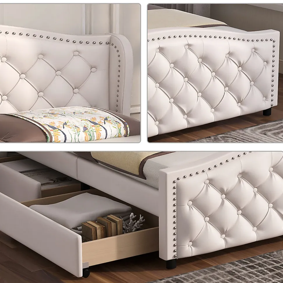 Dimensions totales :212.5x146x100cm(LxLxH)Capacité de charge :300kgCouleur :blancMatériau :PU+MétalNombre de paquets : 2Poids net (kg) : 47.00kgMontage nécessaire : OuiMatelas inclus : NonConception du style:Conçu dans un style Chesterfield, l’aspect est beau et discret. La tête de lit plus haute (99 cm) offre un soutien plus stable et plus confortable pour la tête et le dos. Le lit rembourré est fabriqué en tissu de velours, qui est doux et agréable au toucher et vous offre une expérience de sommeil parfaite.Apparence exquise:L’apparence étonnante d’un lit finement rembourré avec une tête de lit haute dotée d’un matelassage en losange caractéristique et de gros boutons, d’un panneau latéral en forme d’oreille de chaque côté de la tête de lit et d’un anneau de clous argentés autour du bord du panneau latéral. Ce design unique et sophistiqué et les finitions de haute qualité permettent au lit rembourré de combiner des styles modernes et classiques pour donner à votre chambre à coucher un tout nouveau look.Un vaste espace de rangement:Les 2 tiroirs sur roulettes offrent un espace de rangement pour les oreillers, les couvertures, etc. Les tiroirs peuvent être placés à gauche ou à droite, et les tiroirs peuvent être facilement tirés des deux côtés grâce aux roulettes situées sous le lit double.Configuration haut de gamme:Le cadre du lit est composé de bois de haute qualité, d’un cadre en acier et d’éléments de liaison. Le sommier est solide et se compose de pin massif et de supports centraux en acier. Les lattes plus épaisses offrent un soutien optimal à votre propre matelas. Contenu de la livraison du lit capitonné : Cadre de lit, sommier à lattes, instructions de montage (matelas non inclus).