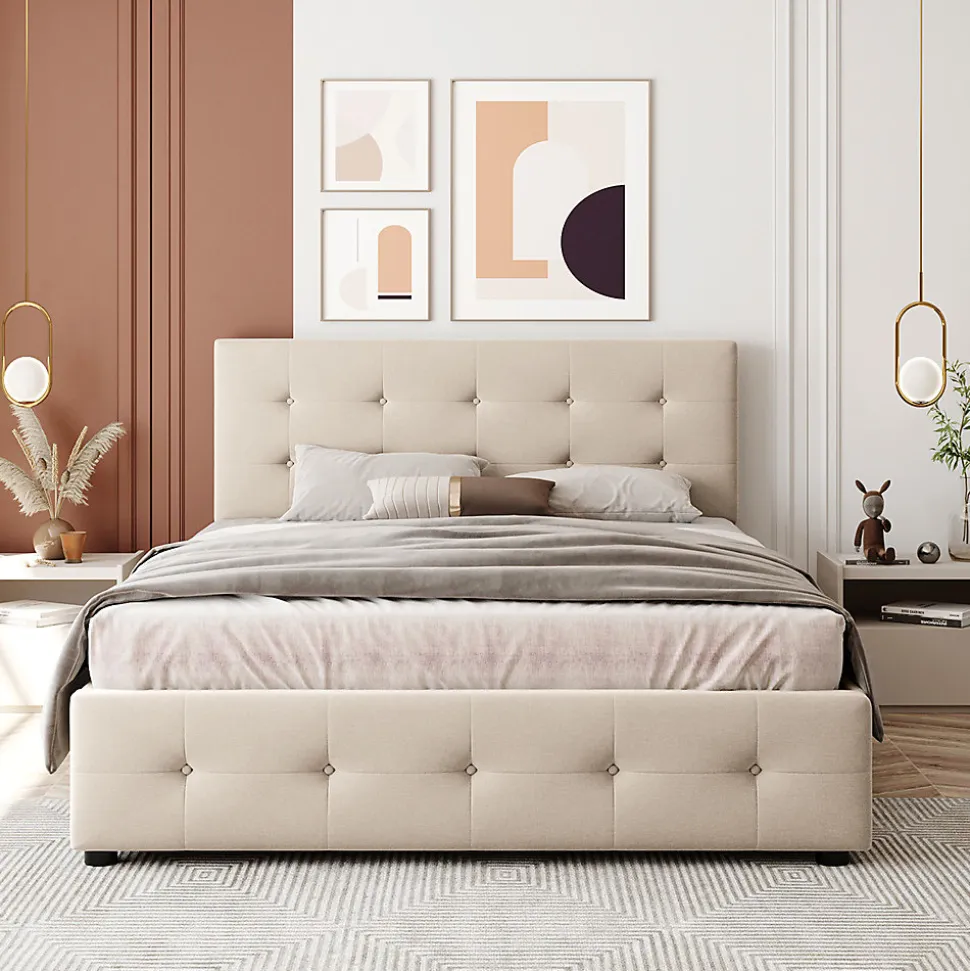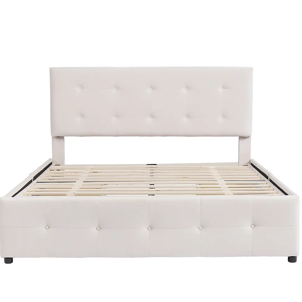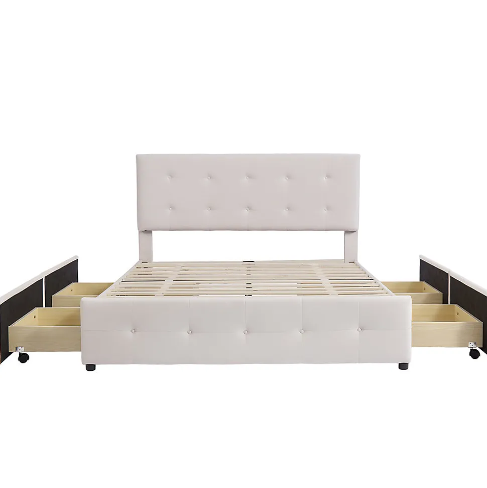 Dimensions totales :210x149x100-106 cm (LxPxH)Capacité de charge :300kgCouleur :BeigeMatériau :VeloursSurface de couchage :140×200 cmNombre de paquets : 2Poids net (kg) : 48.00kgMontage nécessaire : OuiMatelas inclus : NonStyle classique :Cadre de lit robuste de style classique, tissu en velours doux pour la peau et quatre tiroirs de rangement. Ce lit plate-forme rembourré classique est parfait pour les adultes, les enfants et les adolescents et peut être utilisé comme lit d’appoint.Lit à tiroirs :Ce cadre de lit en tissu dispose de 4 tiroirs coulissants (chaque tiroir est équipé de 4 roulettes), qui sont parfaits pour le rangement à la maison. Espace de rangement caché, beau et pratique.Robuste et durable :La structure interne du cadre en acier est solide et durable. Elle est également équipée d’un rembourrage en mousse haute densité. La combinaison de la structure en acier et du rembourrage en mousse est silencieuse, douce et durable, ce qui vous permet de dormir paisiblement et de profiter de la douceur et du confort.Aucun sommier n’est nécessaire :La structure de support à lattes solide peut prolonger la durée de vie des matelas en latex, en mousse à mémoire de forme ou à ressorts, aucun sommier n’est nécessaire.Facile à assembler :Tout ce dont vous avez besoin est emballé et livré dans un colis express ; toutes les pièces, les outils et les instructions sont également inclus. Deux personnes peuvent facilement effectuer l’installation en une heure.Remarques :En raison des mesures manuelles, une erreur de 2 à 3 cm peut se produire.En raison de la lumière, il peut y avoir des différences de couleur entre l’image du produit et le produit réel.Veuillez vous référer au produit que vous avez réellement reçu.