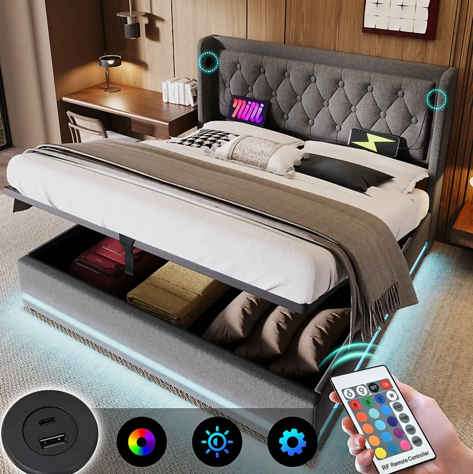 Dimensions totales :210x150x100.5cm(LxLxH)Capacité de charge :300KG/660LBSCouleur :grisMatériau :CotonNombre de paquets :2Poids net (kg) : 41.62kgMontage nécessaire : OuiMatelas inclus : NonStyle classique et design pratique :La tête de lit présente un design classique et touffeté avec des boutons pour soutenir délicatement votre cou et créer un environnement de sommeil douillet.Avec une largeur maximale de 16 cm, le offre une tranquillité d’esprit pour une nuit de sommeil réparateur. Grâce aux ports de charge USB et Type-C situés de part et d’autre du vous pouvez utiliser vos appareils électroniques au lit quand vous le souhaitez sans craindre de tomber en panne de batterie.Espace de rangement sous le lit :Le lit relevable avec rangement est doté d’une conception unique d’élévateur hydraulique à air de haute qualité qui offre un vaste espace de rangement sous le lit et peut être facilement relevé, abaissé ou fermé. Il est parfait pour ranger les objets encombrants ainsi que les objets peu utilisés. Le dessous du lit est recouvert d’un tissu non tissé qui empêche la poussière de pénétrer et permet de garder les choses bien rangées.Système de support solide :Le cadre du lit est fabriqué en acier de haute qualité et les pieds renforcés empêchent la structure de se tordre. Cadre en acier de haute qualité avec des lattes élastiques de haute qualité pour soutenir le dos et fournir une bonne expérience de sommeil, le lit est livré avec une bande d’arrêt pour empêcher le matelas de glisser.Éclairage LED innovant :La bande lumineuse LED à 3 côtés du lit, au design innovant, permet de changer 16 couleurs. Vous pouvez régler différents modes de clignotement et de luminosité pour créer un spectacle lumineux impressionnant entouré de trois côtés pour vous donner une atmosphère de sommeil impressionnante.