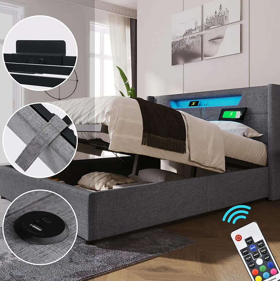 Dimensions totales:212x144x107cm(LxlxH)Capacité de charge:300kg/600lbsCouleur:grisMatériau:linSurface de couchage:140×200 cmNombre de paquets: 2Poids net (kg):49.00kgMontage nécessaire:OuiMatelas inclus:NonDesign chaleureux et confortable:Le corps du lit est enveloppé d’un tissu en lin, la tête de lit est remplie d’éponge, les lignes sont sculptées en forme de V, l’éclairage LED éblouissant donne une double impression de modernité et de rétro. La tête de lit est surmontée d’une oreille latérale, ce qui vous donne un sentiment de sécurité, comme un câlin lorsque vous dormez.Éclairage LED à la tête du lit:L’éclairage LED à la tête du lit ajoute une touche de modernité à votre chambre à coucher. Grâce à la télécommande, vous pouvez changer les couleurs, les vitesses et la luminosité afin de créer une atmosphère unique pour vos moments de repos, en fonction de votre humeur.Station de recharge avec port USB:L’une des caractéristiques les plus utiles est la prise USB intégrée à la tête du lit, qui dispose à la fois d’un port USB intégré et d’un port de type C pour vous permettre de recharger votre téléphone portable et votre tablette avant d’aller vous coucher.Espace de rangement flexible et spacieux:Les téléphones portables peuvent être rangés à la tête du lit. Soutenu par des vérins à gaz, l’espace situé sous les sommiers à lattes peut être utilisé pour ranger des objets volumineux. Le sommier à lattes peut être facilement relevé en soulevant les bandes de tissu.Détails:Ce lit est recouvert d’un tissu en lin gris et est disponible en deux tailles : 140x200cm. Le cadre principal est en fer pour assurer la stabilité du lit et a une capacité de charge de 660lbs pour fournir un support confortable pour le sommeil.Informations détaillées:Lorsque vous déplacez le lit, veuillez le soulever au lieu de le traîner sur le sol.