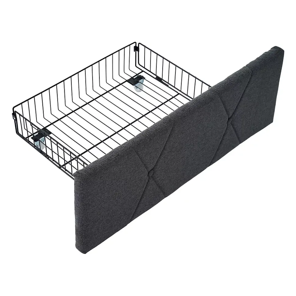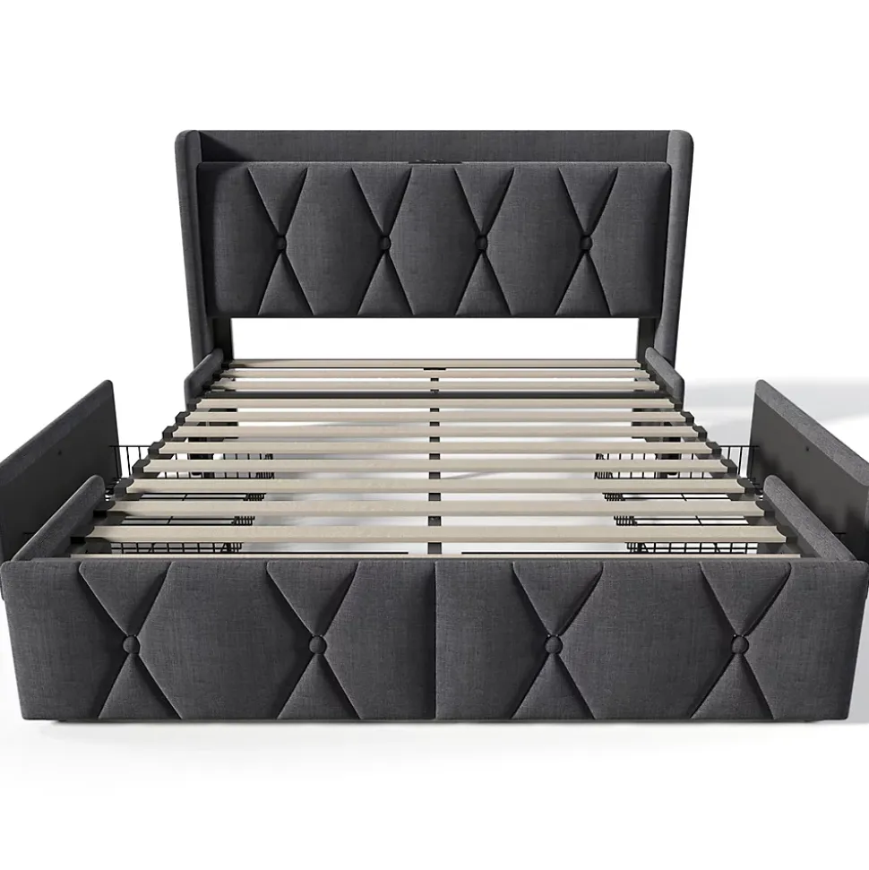 Dimensions totales :217x169x116cm(LxLxH)Capacité de charge :200KG/440LBSCouleur :grisMatériau :linNombre de paquets : 2Poids net (kg) : 50.00kgMontage nécessaire : OuiMatelas inclus : NonAvec un style supérieur :Avec une tête de lit à boutons en forme de diamant et un luxueux revêtement gris recouvrant l’ensemble du cadre, ce lit est à la fois élégant et confortable. La couleur grise est parfaite pour la polyvalence du design, car elle s’adapte à une variété de styles d’intérieur.Une chambre à coucher organisée :Quatre tiroirs offrent un grand espace de rangement, idéal pour la literie ou les vêtements supplémentaires. Avec un tiroir de chaque côté du lit et deux au pied du lit, il est important d’avoir suffisamment d’espace dans la pièce pour accéder aux quatre tiroirs.Tête de lit avec prises de courant et ports USB :L’une des caractéristiques les plus pratiques est la prise intégrée à la tête du lit, que vous pouvez utiliser pour recharger votre téléphone portable et votre tablette avant de vous coucher. Chaque prise est équipée de deux ports de charge aux normes européennes et de deux ports USB.Exceptionnellement durable :Fabriqué à partir de matériaux de haute qualité, ce lit de rangement promet de vous servir pendant des années. Le revêtement en tissu de lin gris est durable dans le temps et les pieds en métal offrent un soutien supplémentaire pour un niveau de soutien exceptionnel qui va de pair avec un confort exemplaire.Assemblage efficace :Le lit de rangement à 4 tiroirs en tissu gris est livré à plat et prêt à être assemblé. Les bricoleurs n’ont pas à s’inquiéter car la conception innovante rend l’assemblage simple, surtout lorsqu’il est combiné avec les instructions claires et complètes incluses avec chaque achat et également disponibles en ligne.