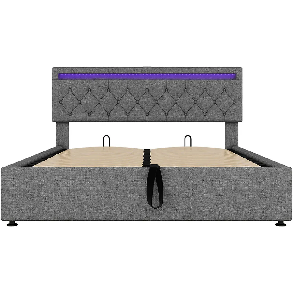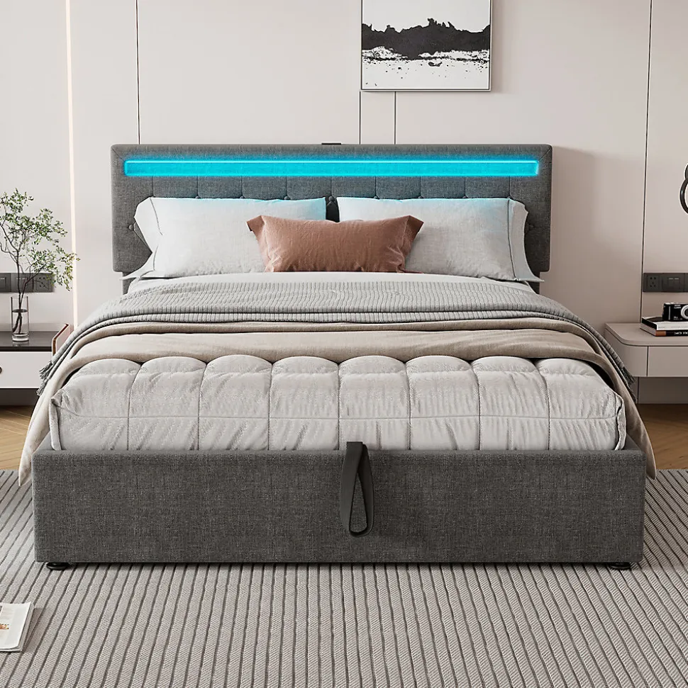 Dimensions totales :210.5×168.5×92/97cm(LxLxH)Capacité de charge :220 kgCouleur :grisMatériau :Lin + Panneau composite de fibres de bois à densitéNombre de paquets : 2Poids net (kg) : 45.20kgMontage nécessaire : OuiMatelas inclus : NonMatériaux de haute qualité : Le corps du lit est fabriqué en tissu de lin et en Panneau composite de fibres de bois à densité, des matériaux durables, dotés d’une structure solide et stable. Le tissu en lin est respirant et agréable au toucher ; le panneau Panneau composite de fibres de bois à densité a une excellente capacité de charge et est imperméable à l’humidité, de sorte que le corps du lit ne se déformera pas et ne s’abîmera pas pendant une utilisation à long terme.Dispositif de levage hydraulique : Le cadre du lit est équipé d’un dispositif de levage hydraulique, et l’espace de rangement sous le lit est conçu pour utiliser efficacement l’espace vertical sous le lit, ce qui permet de ranger facilement les objets rarement utilisés et de garder la chambre à coucher bien rangée.Lumière d’ambiance LED à couleur changeante : La lumière d’ambiance LED installée au-dessus de la tête de lit est également équipée d’une fonction de changement de couleur télécommandée. L’utilisateur peut régler la couleur de la lumière en fonction de son humeur ou des conditions ambiantes, créant ainsi une atmosphère de sommeil romantique, chaleureuse ou calme qui apporte plaisir et confort à la maison.Port de charge pratique : Ce lit est également équipé de ports de charge USB et Type-C afin que les utilisateurs puissent charger leurs téléphones mobiles, tablettes et autres appareils à tout moment pendant le repos, répondant ainsi à la demande moderne de commodité pour le chargement des appareils électroniques.