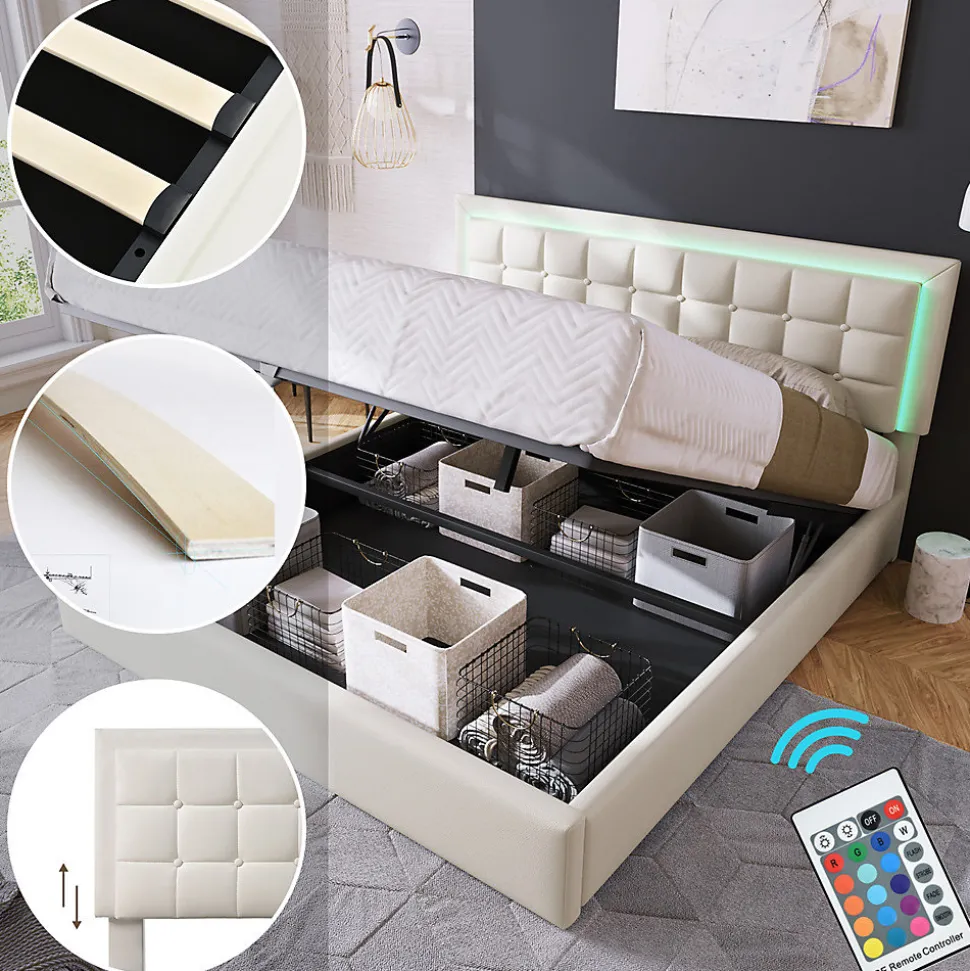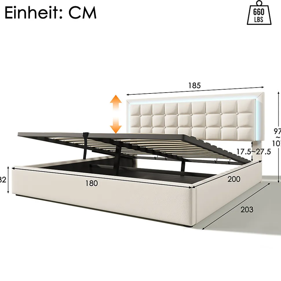 Dimensions totales :203x185x97-107cm(LxLxH)Capacité de charge :299KG/660LBSCouleur :blancMatériau :Bois massif+PU+MétalNombre de paquets : 2Poids net :50.00kgMontage nécessaire : OuiMatelas inclus : NonÉclairage LED – Design élégant :Alors que le revêtement de la tête de lit est élégamment divisé par un matelassage élégant, le pied et la tête de lit sont recouverts d’un similicuir de luxe de haute qualité, disponible en trois tailles. L’éclairage LED ajoute un style moderne à votre chambre à coucher. Grâce à la télécommande, vous pouvez changer les différentes couleurs et la luminosité pour un couchage confortable.Tringle hydraulique – grand espace de rangement :Le sommier offre beaucoup d’espace pour ranger vêtements, linge de lit et autres affaires à l’abri de la poussière. Le tissu Oxford aide à prévenir les taches de moisissure et de mildiou. Il est toutefois recommandé d’aérer régulièrement le sommier. Veuillez placer le matelas sur le lit avant de tester le levier hydraulique.Matériaux privilégiés :Le matériau PU est imperméable et facile à nettoyer. Si vous transpirez beaucoup en dormant, le choix de ce lit en cuir est très approprié, la construction du cadre en acier est testée pour sa capacité de charge, et le sommier est stable lorsque le cadre de lit est correctement assemblé.Expérience de sommeil confortable :Les lattes de lit sont composées de lattes élastiques de haute qualité en bois de pin, de sorte qu’un confort de couchage unique peut être atteint et que les lattes élastiques peuvent mieux prolonger l’utilisation du matelas.Instructions complètes et simples :Le lit est livré à plat pour une livraison facile, et nous avons des instructions utiles, étape par étape, pour un assemblage facile. Veuillez ouvrir le tissu non tissé à l’arrière du lit, les lattes et les autres pièces se trouvent à l’intérieur.