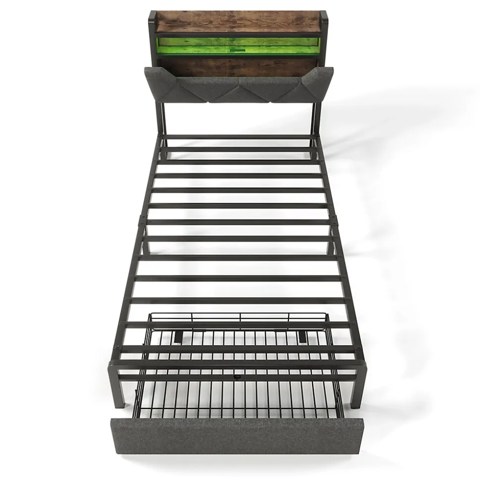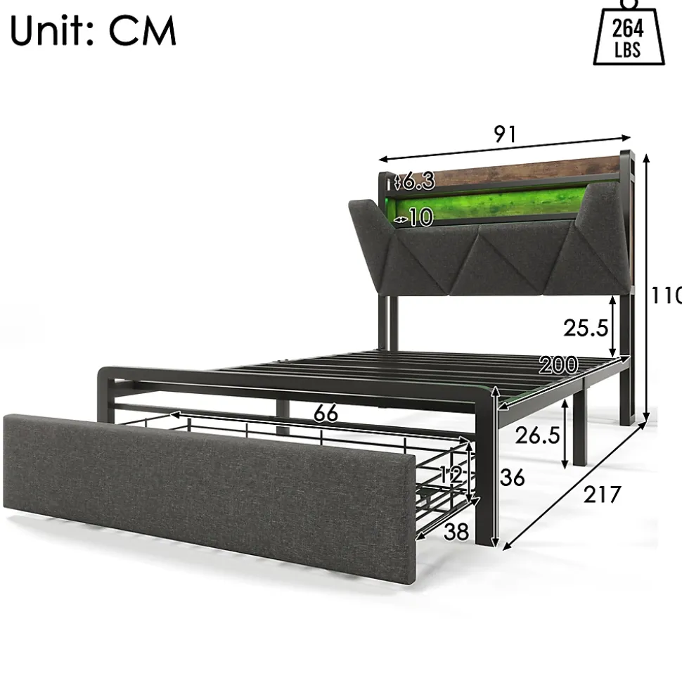 Dimensions totales :217x91x110cm(LxLxH)Capacité de charge :120KG/264LBSCouleur :grisMatériau :LinNombre de paquets : 1Poids net (kg) : 27.00kgMontage nécessaire : OuiMatelas inclus : NonTête de lit avec rangement&Station de recharge étendue :Le cadre de lit comprend une tête de lit de rangement cachée pour les essentiels du quotidien, conçue de manière experte avec un mécanisme à ressort durable pour une ouverture sans effort.Amélioré avec trois ports USB et un port Type-C, cette mise à niveau garantit que vos multiples appareils restent chargés et commodément à portée de main.Cadre de lit led intelligent :Ce cadre de lit à led comprend une tête de lit éclairée par led pour un éclairage d’ambiance et une combinaison de bois rustique et d’accents métalliques pour un look industriel. Vous pouvez choisir parmi de nombreuses couleurs, la luminosité, le mode flash, la durée, etc., et utiliser la télécommande incluse ou l’application mobile pour vous libérer facilement. Et rendez votre vie domestique plus colorée.Pas de grincement&cadre robuste :Conçu avec 13 lattes métalliques et 2 pieds de support en acier robuste, notre cadre de lit a une capacité de charge maximale de 120KG. Les bandes d’amortissement du bruit incluses minimisent efficacement le bruit du lit et vous offrent un environnement de sommeil paisible et silencieux.Grands tiroirs de rangement :Un tiroir de rangement amovible sous le cadre de lit King en métal avec roulettes, offrant un vaste espace de rangement pour les draps, les vêtements hors saison et bien plus encore. La conception spéciale de la serrure garantit que les tiroirs restent toujours bien en place et offre une solution de rangement fiable pour vos affaires.Assemblage facile et expédition dans un seul carton Le cadre de lit est livré avec des instructions détaillées, des outils d’assemblage et des pièces numérotées.
