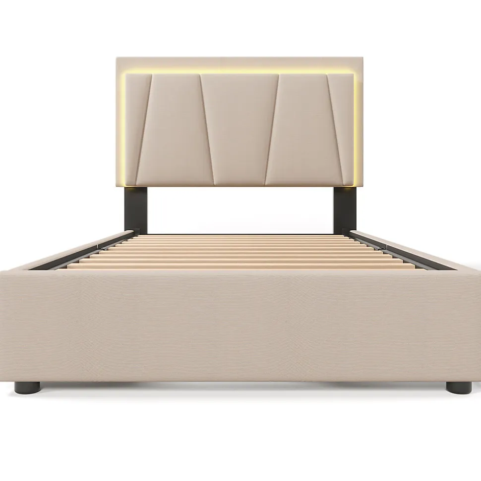 Dimensions totales :207x99x102-112cm(LxLxH)Dimensions intérieures des tiroirs :74.5×49.5x15cmCapacité de charge :300LBSCouleur :BeigePoids net (KG) :32.40kgMatériau :lin + BoisHauteur du pied de lit :30cmSurface de couchage :90×200 cmNombre de paquets : 2Montage nécessaire : OuiType de matelas :Sans matelasTête de lit réglable en hauteur : La tête de lit rembourrée de forme géométrique donne à la chambre à coucher une touche de modernité. La hauteur de la tête de lit est réglable, et la plage de réglage est d’environ 10 cm. Les personnes de différentes tailles peuvent trouver le meilleur confort en réglant la hauteur de la tête de lit. L’épaisseur du matelas applicable est d’environ 25-35 cm.Éclairage LED : L’éclairage LED ajoute un style moderne à votre chambre à coucher. Grâce à la télécommande, vous pouvez changer les différentes couleurs et la luminosité pour un couchage confortable.Rangement : Le Single est équipé de deux tiroirs que vous pouvez placer à gauche ou à droite en fonction de la disposition de la pièce. Il y a beaucoup d’espace pour les couvre-lits et les housses de couette.La praticité rencontre le design : Le lit harmonise habilement un design élégant et un confort maximal. Les boutons décoratifs affinent la tête de lit et lui donnent une touche moderne.Le cadre du lit est principalement en fer, il est durable et a une capacité de charge allant jusqu’à 300 LBS.Les pieds de soutien supplémentaires du pôle central peuvent assurer la stabilité fiable du lit.Informations détaillées : Pour réduire le risque de dommages, ce cadre de lit est expédié dans 2 boîtes et ils peuvent arriver à des jours différents. Si les deux colis sont arrivés mais qu’il manque des pièces, veuillez contacter le service clientèle et si vous déplacez le lit, veuillez le soulever au lieu de le traîner sur le sol.