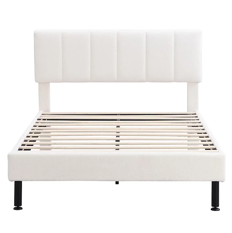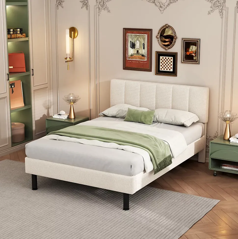 Dimensions totales :195x143x110cm(LxLxH)Capacité de charge :300kgCouleur :beigePoids net :26 kgMatériau du plateau :SherpaHauteur du pied de lit :28.5cmSurface de couchage :140x190cmNombre de paquets : 2Montage nécessaire : OuiType de matelas :sans matelasTissu sherpa confortable : Le tissu sherpa est doux et confortable et vous offre un environnement de sommeil chaud. Sa texture pelucheuse procure une sensation de douceur supplémentaire et rend votre sommeil plus confortable.Sommier à lattes robuste : Le cadre de lit est doté d’un sommier à lattes qui offre un excellent soutien et un grand confort. Le sommier à lattes répartit uniformément la pression, ce qui rend votre sommeil plus confortable tout en garantissant une plus grande durabilité.Conception des pieds en fer : Les pieds en fer du lit sont non seulement solides et durables, mais ils offrent également un soutien stable. La combinaison des pieds en fer forgé et du corps du lit peut donner au lit une esthétique industrielle.Design simple : Le design du lit est simple et élégant, sans décoration inutile et encombrante, reflétant le style moderne et épuré. Ce design ne donne pas seulement au lit un aspect plus frais et plus ordonné, mais il lui permet également de s’adapter plus facilement à différents styles d’habitation.Convient à différents scénarios : Les dimensions de ce lit sont de 140 x 190 cm et il peut être arrangé et utilisé selon les besoins à tout moment. Qu’il s’agisse d’une maison familiale ou d’un appartement, il y a de quoi répondre à vos besoins.Remarques :En raison des mesures manuelles, une erreur de 2 à 3 cm peut se produire. Ce produit sera divisé en deux colis pour la livraison. Il se peut qu’ils n’arrivent pas en même temps. Veuillez patienter.