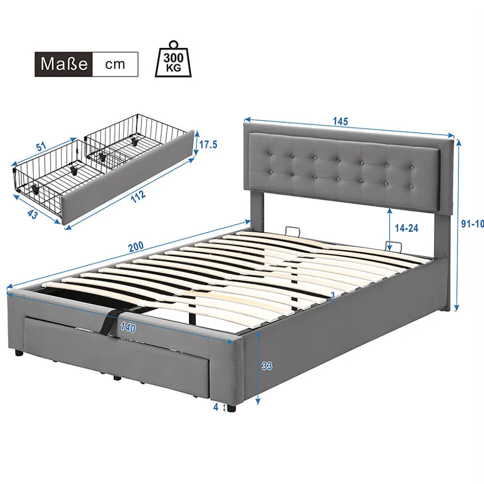 Dimensions totales :200x145x91-101cm(LxLxH)Capacité de charge :300kgCouleur :grisPoids net :49 kgMatériau du plateau :VeloursHauteur du pied de lit :33cmSurface de couchage :140x200cmNombre de paquets:2Type de matelas :sans matelasMontage nécessaire : OuiAspect élégant :Le lit est de style européen simple, il respire l’élégance pure, apporte une couleur élégante à votre chambre et convient parfaitement à la décoration intérieure.Tête de lit réglable en hauteur :La tête de lit peut être réglée de 10 cm vers le haut ou vers le bas, ce qui permet de répondre aux besoins des différentes morphologies. La tête de lit est douce et confortable, ce qui permet de soutenir confortablement votre corps lorsque vous vous appuyez sur la tête de lit.Fonction de rangement puissante :Le lit est doté d’une fonction de rangement puissante, combinée à des barres hydrauliques et à des tiroirs en treillis métallique. Facile à nettoyer au quotidien, il offre un espace de rangement pour vos affaires et permet de garder votre chambre propre et confortable.Support robuste à trois pieds :Le cadre de lit est soutenu par trois pieds en métal, et l’espacement scientifique des pieds de soutien rend votre lit plus ferme et plus stable pendant l’utilisation.Composition simple :Le design du lit est simple et élégant, et il est facile à assembler selon les instructions, ce qui vous permet de gagner un temps précieux. Si vous rencontrez des problèmes pendant le processus d’assemblage, veuillez nous contacter à temps.Remarques :En raison des mesures manuelles, une erreur de 2 à 3 cm peut se produire.Ce produit sera divisé en deux colis pour la livraison. Il se peut qu’ils n’arrivent pas en même temps. Veuillez patienter.