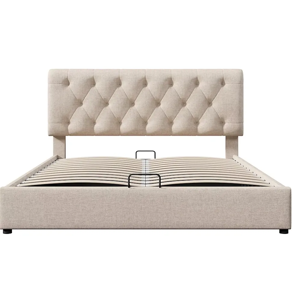 Couleur : NaturelDimensions hors tout : 212 x 148 x 106-112 cm (L x l x H)Espace de rangement interne : 195 x 24 x 136 (l x H x P)Tête de lit réglable : 106-112 cmMatériau des panneaux : bois massif + lin + métalPoids maximal de l’utilisateur : 220 kg/485 lbsDistance de la tête de lit : 22-28 cmSommier requis : nonAssemblage requis : ouiContenu du colis : cadre de litMatelas compatible (matelas non inclus) : 140 x 200 cmNombre de colis : 2Tête de lit réglable en hauteur : La hauteur de la tête de lit est réglable, avec une différence d’environ 6 cm. Les personnes de tailles différentes peuvent trouver le meilleur confort en réglant la hauteur de la tête de lit. L’épaisseur du matelas applicable est d’environ 22-28 cm.Barre hydraulique – grand espace de rangement : Grand sommier sous le cadre à lattes repliable avec beaucoup d’espace de rangement pour les couvertures, les oreillers ou le linge de lit, le cadre à lattes peut être facilement replié par le vérin de levage.Construction solide :Les lattes du lit sont faites de lattes élastiques de haute qualité en bois de pin, ce qui permet d’obtenir un confort de couchage unique et les lattes élastiques peuvent mieux prolonger l’utilisation du matelas.Pour empêcher le matelas de glisser, l’avant et l’arrière du cadre de lit sont également équipés de languettes de traction en fer.Tissu doux pour la peau :Le tissu confortable et la tête de lit réglable vous permettent de vous asseoir et de lire ou de regarder la télévision tous les soirs.Informations détaillées Disponible en deux tailles : 140×200 cm/160×200 cm.Pour réduire le risque de dommages, ce cadre de lit est expédié dans deux cartons qui peuvent arriver à des jours différents. Si les deux colis sont arrivés mais qu’il manque des pièces, veuillez contacter le service clientèle.