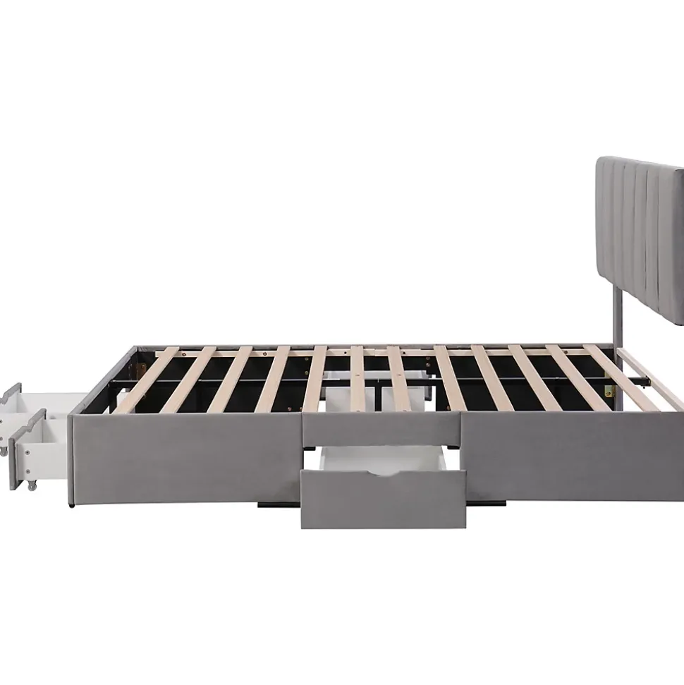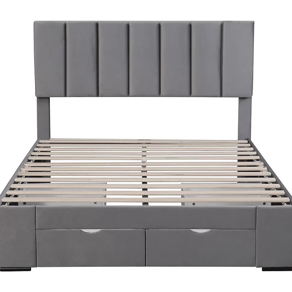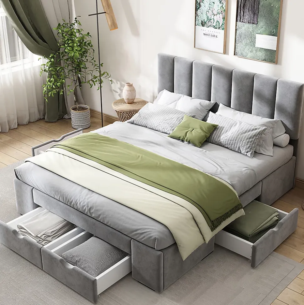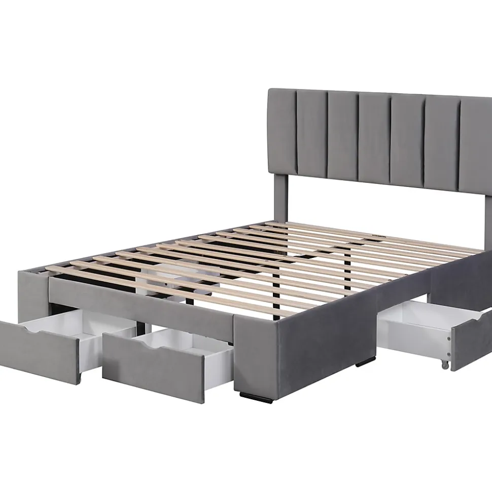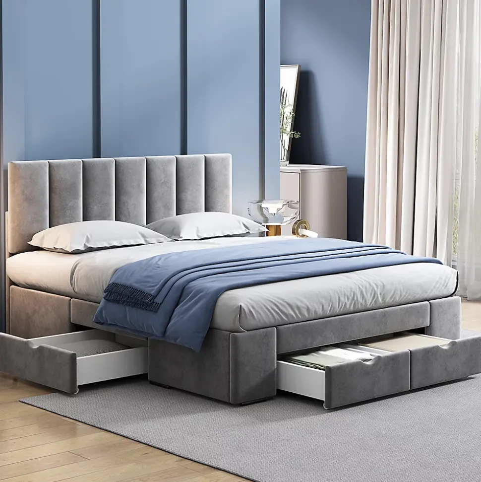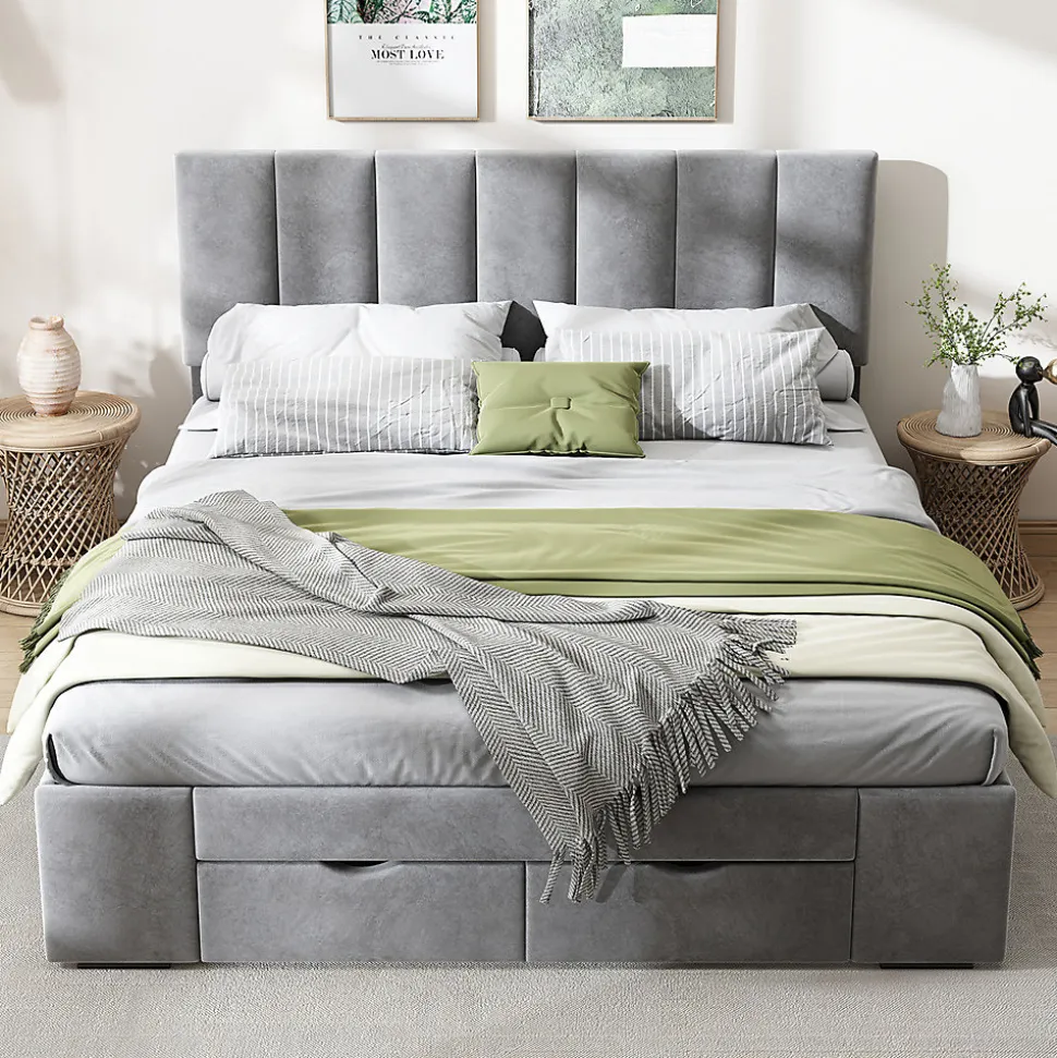 Dimensions totales :203.5x142x95.5-106.5 cm (LxPxH)Capacité de charge :220 kgCouleur :grisMatériau :Bois +VeloursSurface de couchage :140×200 cmNombre de paquets : 2Poids net (kg) : 45.00kgMontage nécessaire : OuiMatelas inclus : NonStyle classique :Le lit rembourré a un design classique mais moderne et s’adapte à la plupart des styles d’intérieur.Structure robuste :Le cadre du lit rembourré est stable, facile à assembler et la surface de couchage du lit est de 140*200 cm. Le velours doux pour la peau assure une sensation de confort et d’intimité. Les lattes en bois durables soutiennent et prolongent la durée de vie de votre matelas.Nombreuses fonctions :La tête de lit haute contre laquelle vous pouvez vous appuyer offre des nuits reposantes et un sommeil paisible. Les 4 tiroirs sur roulettes offrent plus d’espace de rangement. Les lattes en bois minimisent le bruit pendant votre sommeil et prolongent la durée de vie de votre matelas. La tête de lit à rembourrage épais est idéale pour s’adosser en lisant ou en regardant la télévision. La hauteur de la tête de lit est réglable.Durable :La construction robuste de la tête de lit est durable et ajoute un style chic à votre chambre.Assemblage facile avec des instructions claires :Vous pouvez installer le lit rembourré grâce aux instructions claires. Si vous rencontrez des problèmes, veuillez contacter notre service clientèle, nous vous fournirons la meilleure solution dès que possible.Remarques :En raison des mesures manuelles, une erreur de 2 à 3 cm peut se produire.En raison de la lumière, il peut y avoir des différences de couleur entre l’image du produit et le produit réel.Veuillez vous référer au produit que vous avez réellement reçu.