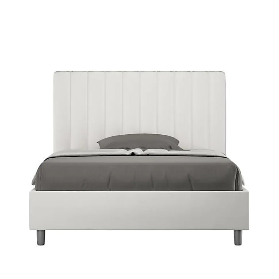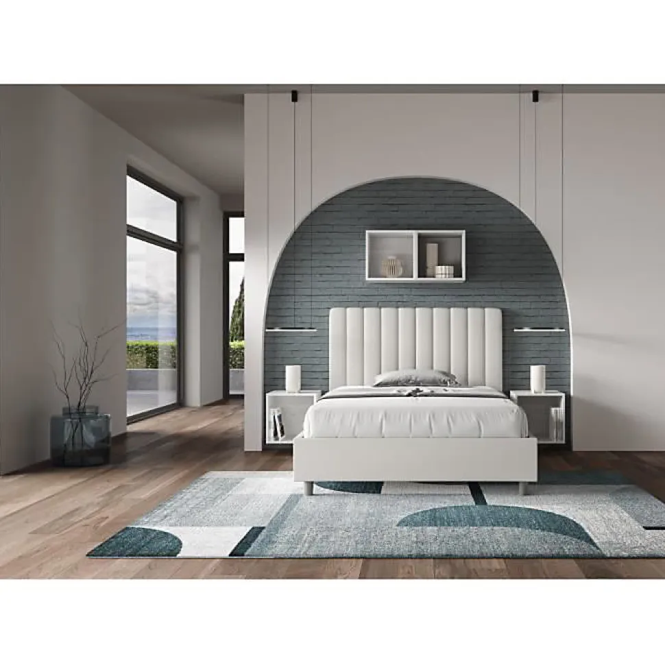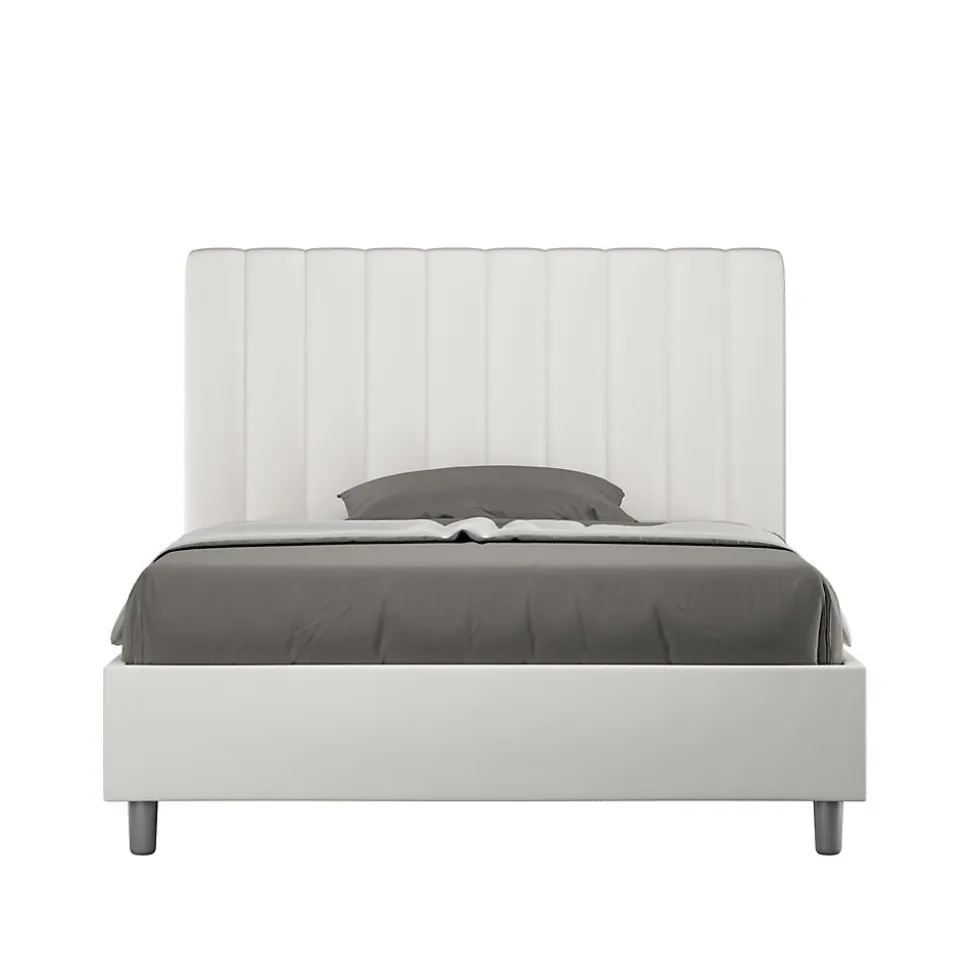 Lit queen size Agueda 120×210 avec tête de lit et lit rembourrés, revêtement en simili cuir, particulièrement polyvalent et facilement combinable avec n’importe quel style d’ameublement.Le lit queen size Agueda 120×210 se caractérise par un style moderne et élégant, mis en valeur par la tête de lit matelassée recouverte de simili cuir.La présence du matériau en simili cuir, en plus de donner à la pièce une atmosphère accueillante et invitante, offre la commodité d’un nettoyage rapide et facile, grâce à l’utilisation d’un simple chiffon en microfibre.Lit fourni avec sommier à lattes, prévu pour un matelas 120×210 cm – Matelas non inclusCouvre-lit non amovible.Produit ItyhomeFabriqué en ItalieDimensions lit : L.135 P.230 H.122 cmHauteur des pieds : 12 cmHauteur du lit : 27 cmHauteur du filet depuis le sol : 39 cm