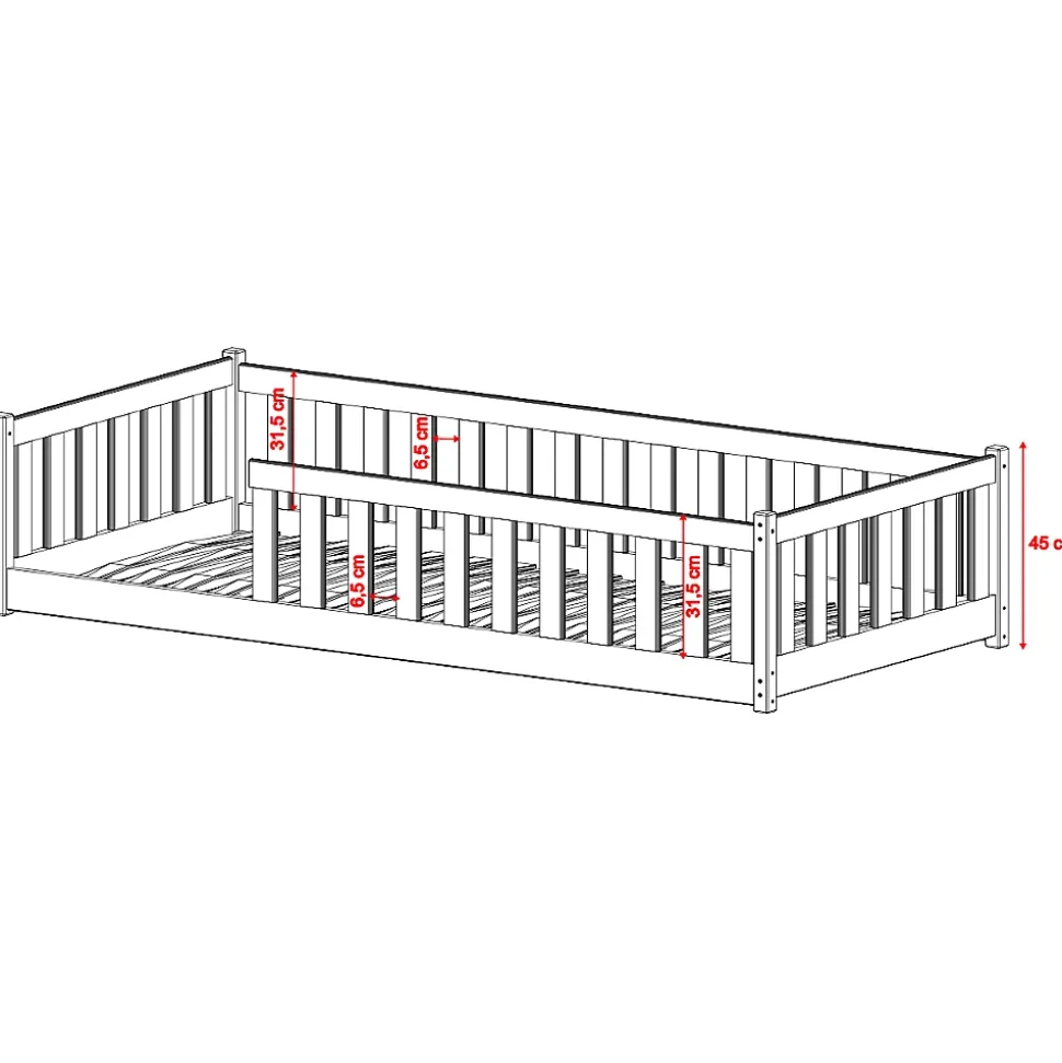 - Lit : Poids maximum conseillé : 100 kg – Sommier à lattes inclus – Hauteur maximum conseillée pour le matelas : 13 cm vendu séparément – Barrière pouvant être montée à droite ou à gauche incluse
