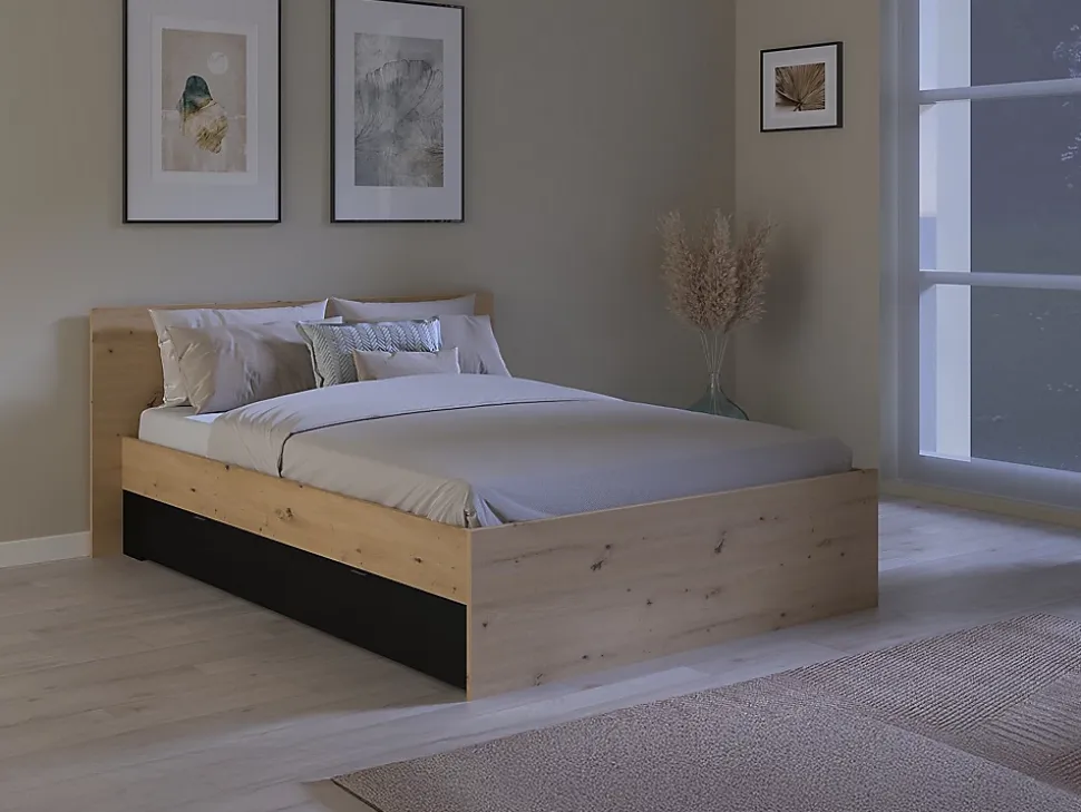 - Lit avec 2 tiroirs 140 x 190/200 cm – Structure : Panneaux de particules – Coloris : Naturel et noir – Dimensions : L164,5 x P204 x H83 cm – Style : Contemporain – Tous vos essentiels à portée de lit avec VARLY !