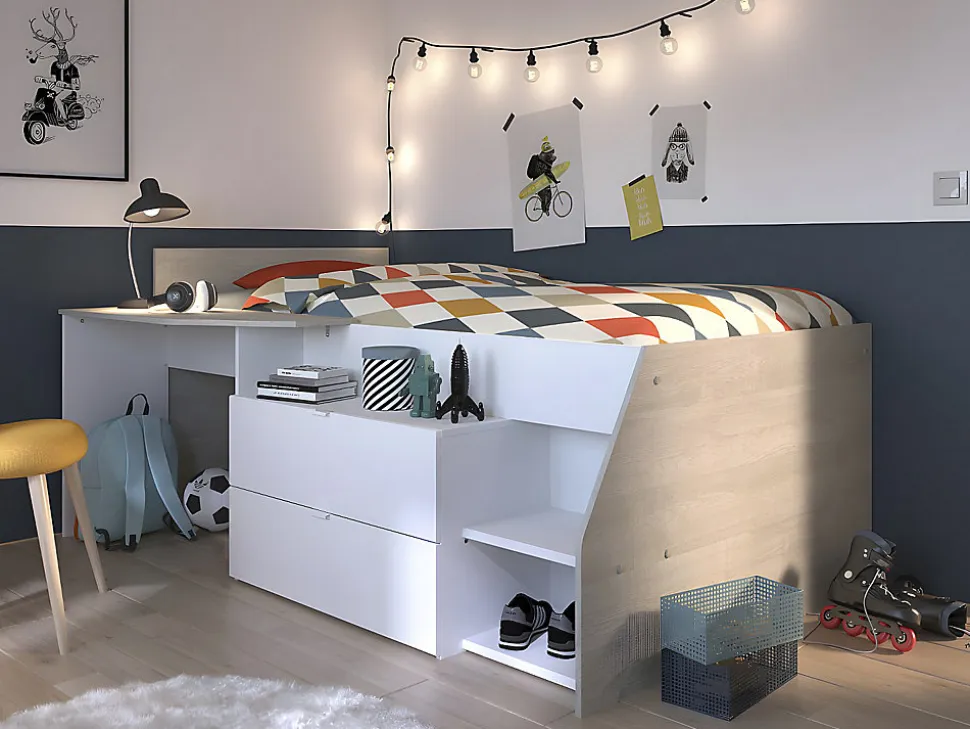 En un seul lit, profitez de toutes sortes de rangements : un bureau, un espace bibliothèque, 2 tiroirs façon commode, un espace de rangement sous le lit. Ses coloris sobres et tendances en font un lit mixte. De plus, ses découpes apportent encore plus de style à ce lit toutes fonctions. A savoir : ce lit est compatible avec tous les sommiers et matelas 90 x 190 cm et 90 x 200 cm mais nous vous proposons ici un sommier et un matelas de la taille la plus grande et non modulable, c’est-à-dire 90 x 200 cm.1 x Lit combiné GISELECaractéristiques Couleur (nuance) : Blanc, Naturel clair Matière (précision) : Panneau de particule Finition : Mélaminé Taille (couchage) : 90 x 190 cm, 90 x 200 cm Nombre de places : 1 place Avec bureau Type de rangement : 2 tiroirs Tiroir coulissant Gamme : Good for Planet Produit : Fabriqué en France À monter soi-même : 1 volume de rangement sous le lit : 2 tiroirs sur coulisses à galets Finition : Mélaminée : Le lit est compatible avec tous les matelas et sommier 90x200cmDimensions Longueur : 203 cm Hauteur : 90 cm Profondeur : 135 cm Bureau : L100 x P39 cm Tiroirs : L75 x P35 cm1 x Matelas classique DANAECaractéristiques Technologie (âme) : Mousse Soutien : Ferme Densité (âme) : 20 kg/m³ Technologie matelas (accueil) : Mousse de confort Densité (accueil) : 20 kg/m³ Accueil : Tonique Garnissage du matelas : Fibres de polyester Densité (garnissage) : 120 g/m2 Coutil (matière) : Polyester Couleur (nuance) : Blanc Matière (précision) : 100 % Polyester Taille (couchage) : 90 x 200 cm Nombre de places : 1 place Réversible été/hiver Gamme : Good for Planet Garantie : 5 ans Produit : Fabriqué en Europe Compressé/roulé : Compressé/rouléDimensions Longueur : 200 cm Hauteur : 15 cm Profondeur : 90 cm Epaisseur matelas : 15 cm Hauteur de l’âme : 12 cm1 x Cadre à lattes KALISTACaractéristiques Couleur (nuance) : Noir Matière (précision) : Métal Epaisseur métal : 1.2 mm Taille (couchage) : 90 x 200 cm Nombre de