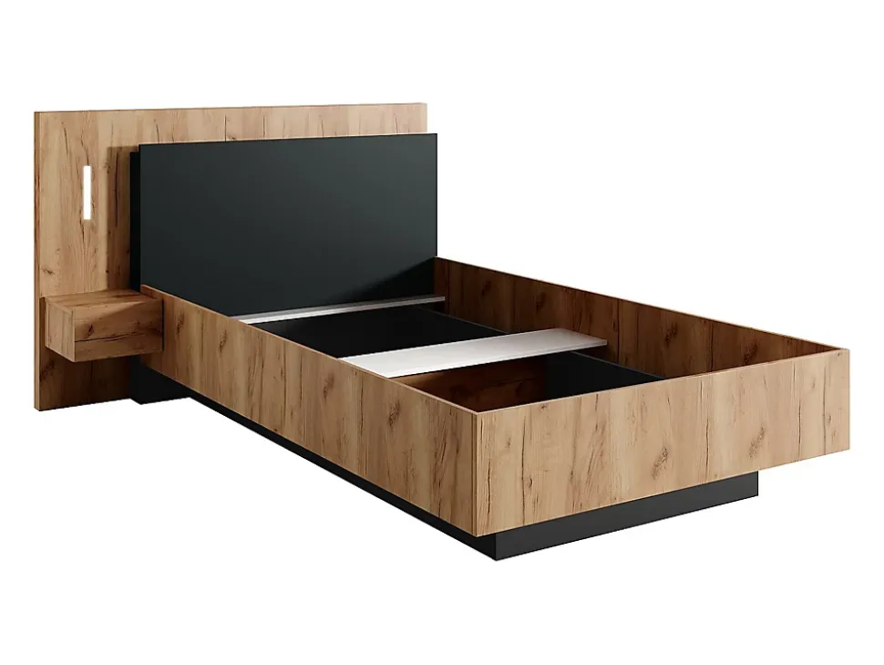 La collection FRANCOLI vous offre divers rangements pour équiper votre logement. 1 x Cadre de lit FRANCOLICaractéristiques Couleur (nuance) : Naturel clair, Gris anthracite Matière (précision) : Panneau de particule Finition : Mélaminé Taille (couchage) : 120 x 200 cm Nombre de places : 1 place Réversible Avec leds Couleur des LEDs : Blanc Type de commande : Interrupteur Type de branchement : Prise secteur Sans matelas Avec chevet Type de rangement : 1 tiroir Tiroir coulissant push to open Produit : Fabriqué en Europe À monter soi-même : LEDs 12 V avec interrupteur pied Charge maximale supportée par le chevet : 3 kg Charge maximale supportée par le tiroir : 3 kg : Ce lit est compatible avec tous les matelas et sommiers de 120×200 cmDimensions Longueur : 220 cm Hauteur : 102 cm Profondeur : 157 cm Hauteur de couchage : 42 cm1 x Cadre à lattes KALISTACaractéristiques Couleur (nuance) : Noir Matière (précision) : Métal Epaisseur métal : 1.2 mm Taille (couchage) : 120 x 200 cm Nombre de places : 1 place Sans pieds Technologie (sommier) : Lattes actives Nombre de lattes : 38 lattes Matière des lattes : Bois (peuplier) Charge maximale supportée : 250 kg À monter soi-même : Cadre métal laqué epoxy cintré sur chantDimensions Longueur : 198 cm Hauteur : 5 cm Profondeur : 118 cmLivraisonLors de la livraison, il est conseillé de vérifier que le bon nombre de colis a été livré.Colis1 x Cadre de lit FRANCOLIColis n°1 : Longueur 224 cm, Largeur 32 cm, Hauteur 10 cm, Poids 33 kg. Colis n°2 : Longueur 134 cm, Largeur 95 cm, Hauteur 5 cm, Poids 35 kg. 1 x Cadre à lattes KALISTAColis n°1 : Longueur 203 cm, Largeur 33 cm, Hauteur 7 cm, Poids 18 kg.