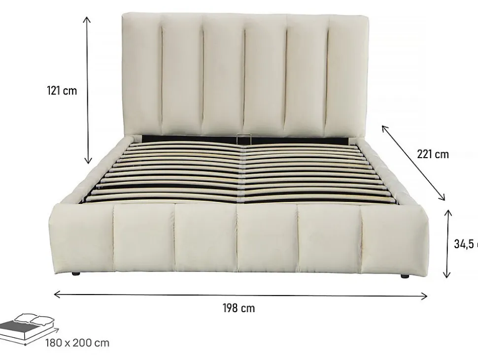 Lit avec coffre « Annie » – 221 x 198 x 121 cm – BeigeDécouvrez notre lit « Annie » doté d’un coffre astucieux, combinant style et fonctionnalité. Ce lit élégant vous offre un espace de rangement discret pour garder votre chambre bien organisée, tout en garantissant un sommeil confortable. Optez pour la solution parfaite pour gagner de l’espace sans compromettre le design et profitez d’une chambre à coucher à la fois esthétique et pratique. Lit double en velours avec coffre « Annie » – 180 x 200 cm – Coloris Beige – Sommier à lattes inclus – 24 lattes – Dimensions: 221 x 198 x 121 cm .Descriptif: Découvrez notre lit pratique et élégant, doté d’un coffre secret pour une chambre organisée et une nuit paisible. Le compromis parfait entre style et fonctionnalité.Matière(Filtre): Velours.Matières: Velours.Structure: boisCouleurs: beigeFinition: Beigecouleur (filtre): BeigeDimensions: 221 x 198 x 121 cmLongueur: 221 cmLargeur: 198 cmhauteur: 121 cmDimensions du couchage: 180×200 cmDimensions (Filtre): 180 x 200 cmSommier: inclusSommier: OuiDimensions des lattes: Dimensions des lattes : 885 x 54 x 10 cmLattes: 26Tête de lit: Tête de lit : L 198 x H 123 cm, Epaisseur tête de lit : 14,5 cmÉclairage LED: Non.Tiroirs: Non.Coffres: 1 coffrepieds: 4, Dimensions des pieds : L 201 x H 34,5 cmPoids: 89.4 kgColisage: 2 colis : – 2,01 x 1,22 x 0,16 m, 59 kg – 2,13 x 0,4 x 0,38 m, 42,5 kg