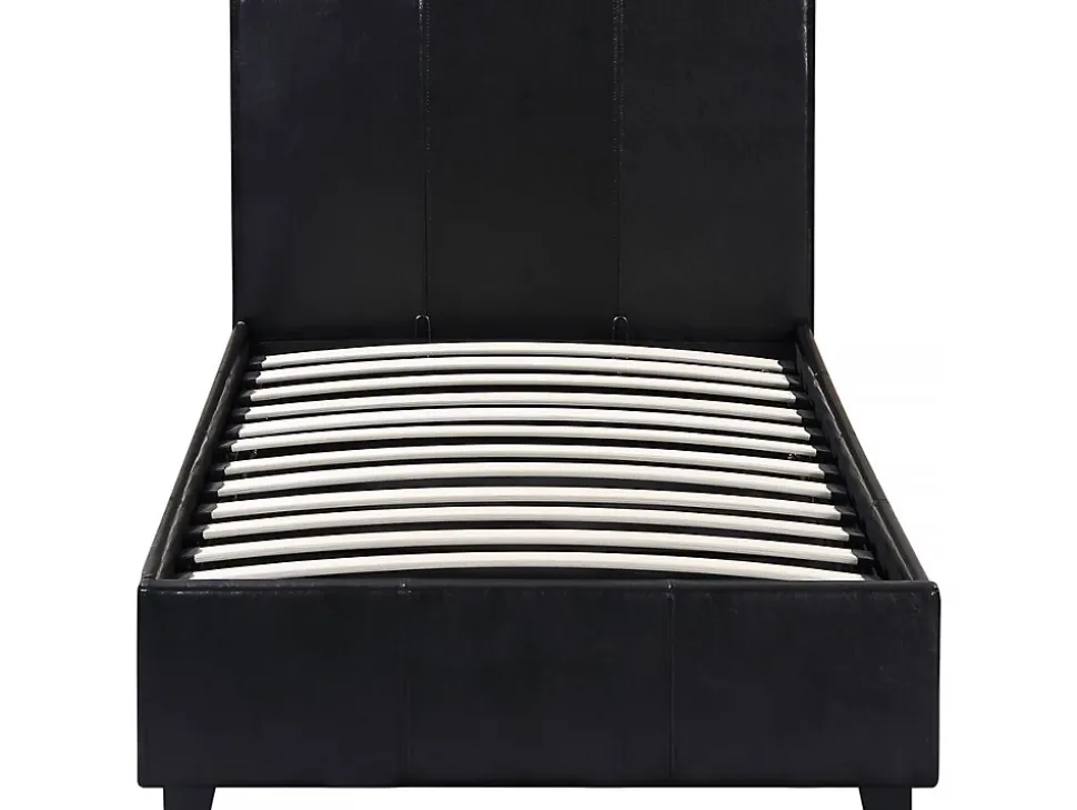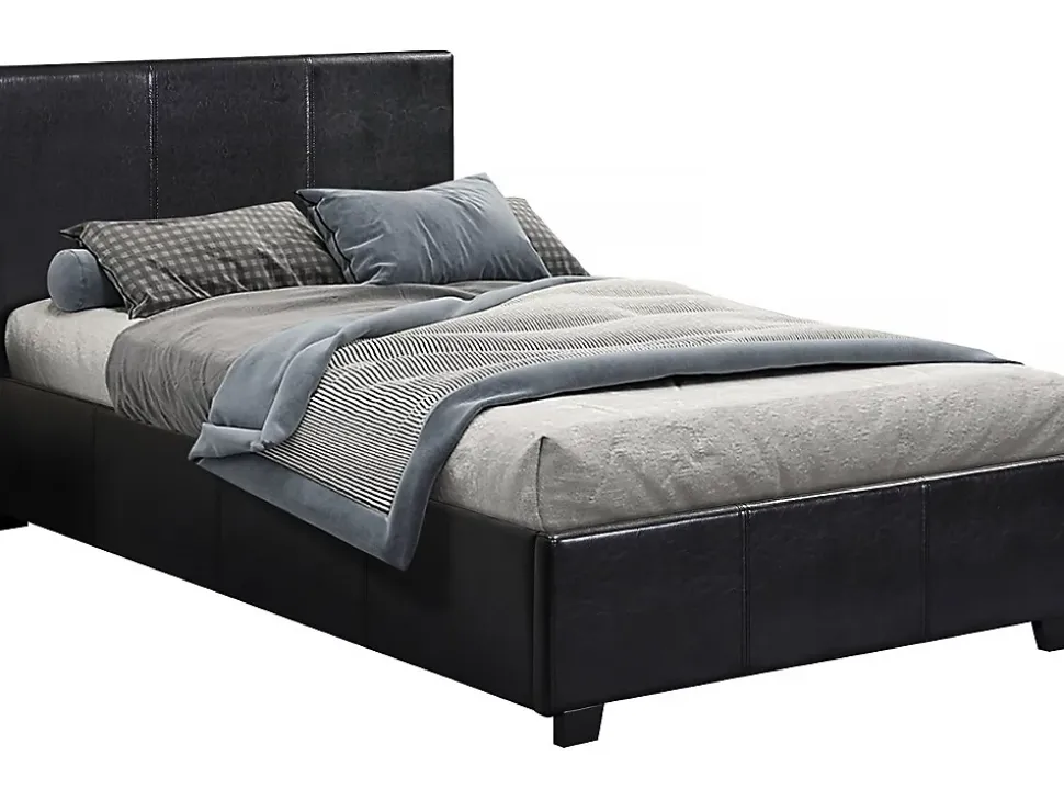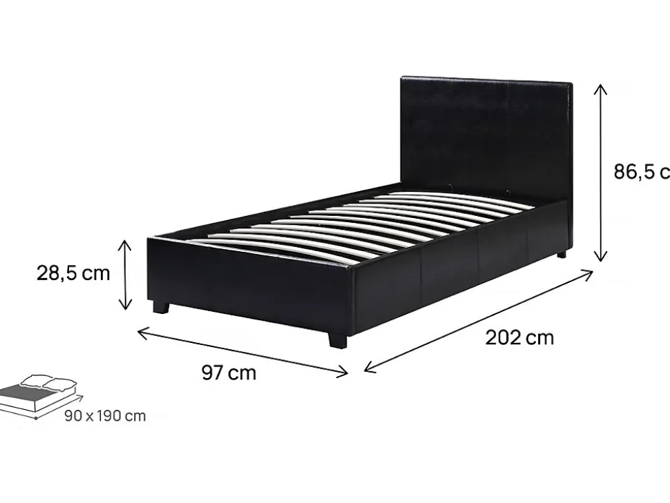 Lit « Carla »Offrez-vous un moment de détente avec ce lit simple ! Idéal pour tous les univers de décoration, il ira à ravir avec votre chambre. Ajoutez un matelas de notre gamme et passez un instant privilégié dans votre petit chez vous. C’est cadeau !Un coffre de rangement intégré vous permettra en plus de dissimuler toutes vos affaires !Existe en plusieurs dimensions. Existe en plusieurs coloris. Lit PVC « Carla » noir – 1 personne – Dimensions lit : 203 x 97 x 86 cm- Dimensions matelas : 90 x 190 cm – Structure en contre plaqué – Pieds en bois – Recouvert de PVC – Sommier à lattes et tête de lit inclus – Coffre de rangement en toile inclus .Descriptif: Apportez un changement à votre quotidien avec notre lit Carla – Sommier à lattes et tête de lit inclus – Matelas vendu séparément – Fond du coffre en toileMatière(Filtre): Simili cuirMatières: Simili cuirCouleurs: noircouleur (filtre): NoirDimensions: 203 x 97 x 86 cmDimensions du couchage: 90×190 cmDimensions (Filtre): 90 x 190 cmTiroirs: Coffre de rangement inclus Dimensions : 192 x 92 x 16 cmCoffres: Fond du coffre en toilepieds: 6,5 x 3,5 x 4,5 cm – BoisPoids: 38.5 kgColisage: 2 colis : – 0,995 x 0,995 x 0,07 m, 11,5 kg – 2 x 0,275 x 0,155 m, 27 kg