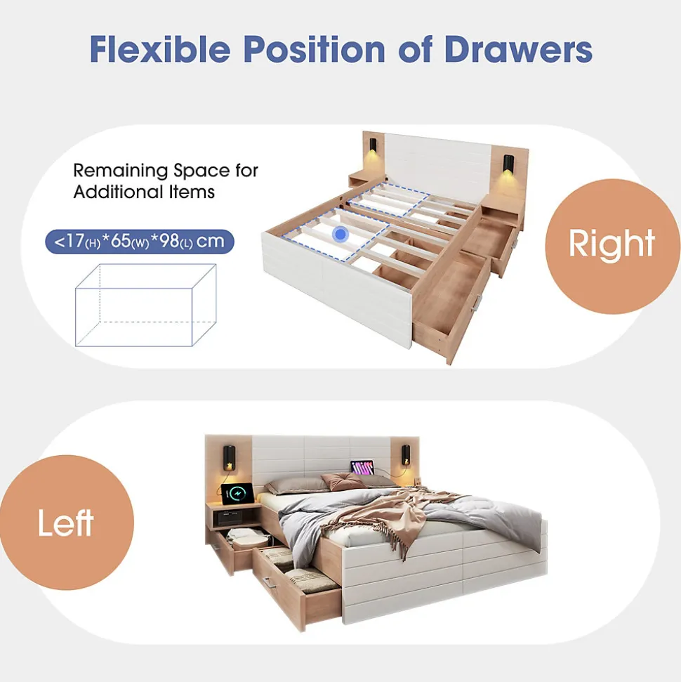 ▶ ▶ Détails ▶────────────────● Dimensions totales : 215×80×207 cm (L x H x l)● Matériau : Bois massif + MDF● Couleur : Blanc + Chêne● Surface de couchage : 140×200 cm (Sans matelas)● Épaisseur de matelas recommandée : 25 cm● Poids maximal supporté : 181KG / 400LBS● Montage requis : Oui● Contenu du colis : Cadre de lit + Sommier à lattes + Deux tiroirs● Nombre de colis : 4● Poids brut/net : 94.61 / 84.61 KG● Design unique : Lampe de chevet + Charge USB● Dimensions intérieures des tiroirs : 90×68×10 cm (L × P × H)● Espace de rangement sous le lit : 19 cm► Remarques ►※ Ce produit sera expédié en 4 colis. Ils peuvent ne pas arriver simultanément. Veuillez patienter.※ En raison de mesures manuelles, un écart de 2-3 cm peut survenir.※ En raison de l’éclairage, des différences de couleur peuvent apparaître entre l’image du produit et le produit réel. Veuillez vous référer au produit que vous avez reçu.※ Si vous avez des questions pendant l’installation, veuillez nous contacter dès que possible.