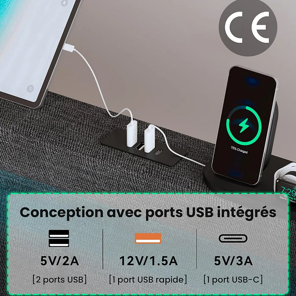 - 【Tête de Lit Connectée】La tête de lit intègre trois ports USB et un port Type-C, permettant de charger plusieurs appareils simultanément, tout en gardant livres, lunettes et téléphones à portée de main pour un accès pratique.
