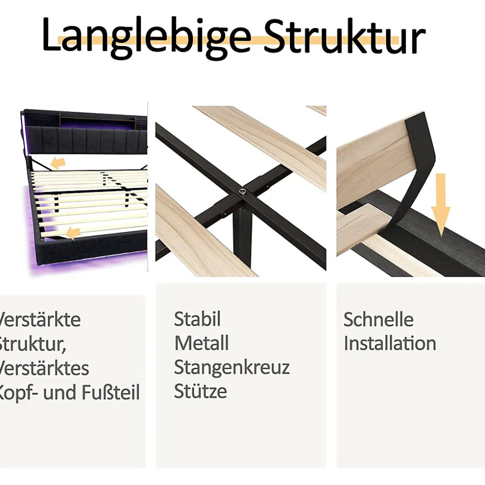 - 【Design Moderne et Flottant】 Grâce à son design unique, le lit semble flotter, créant un effet visuel moderne et élégant. L’absence de pieds visibles et la finition épurée permettent de l’intégrer facilement dans n’importe quel décor de chambre à coucher.