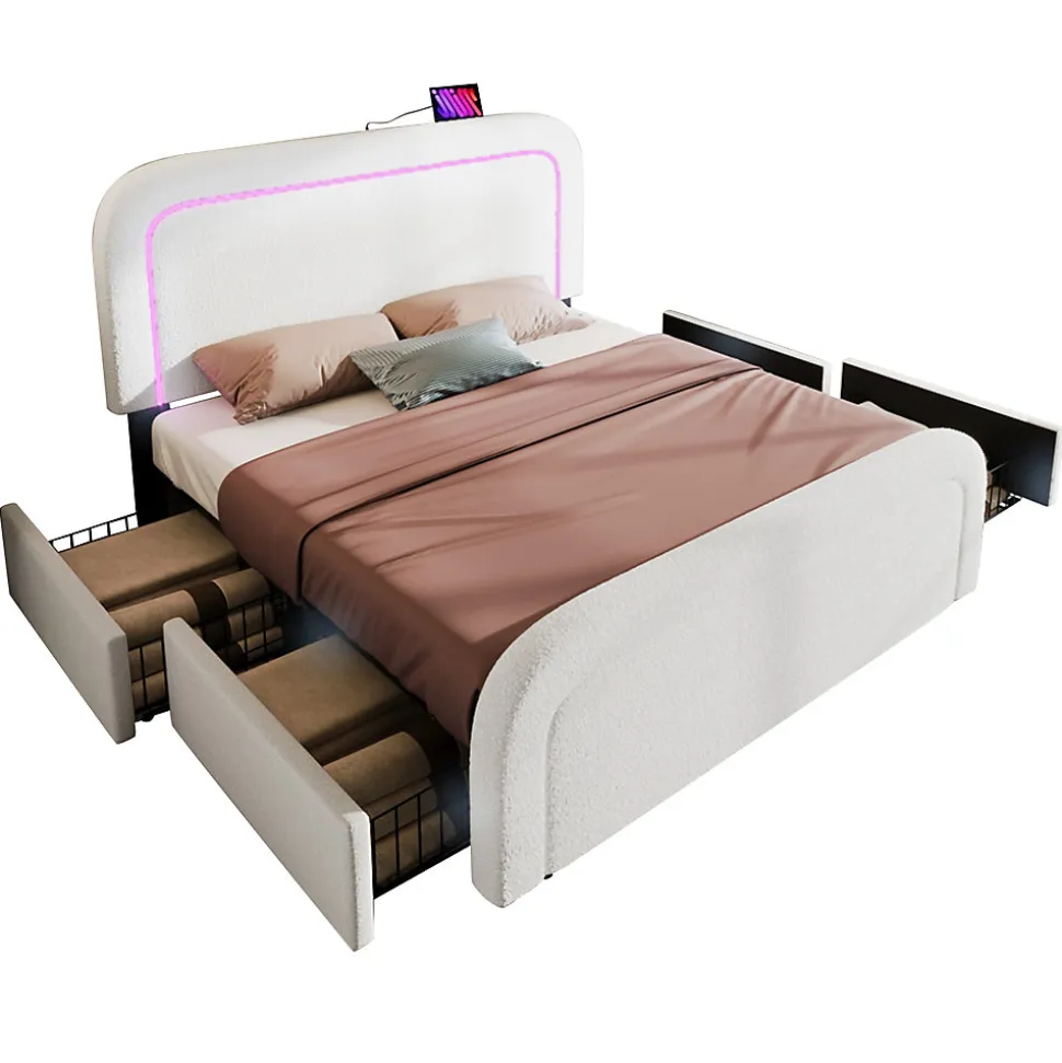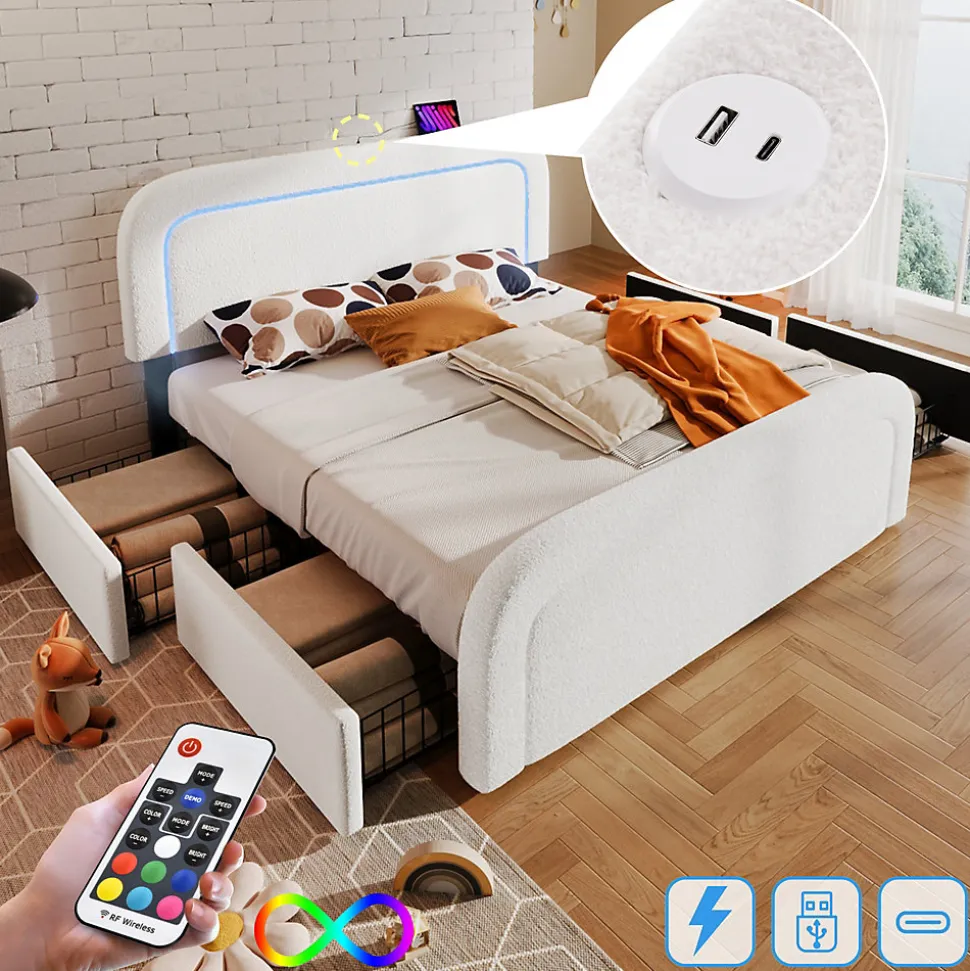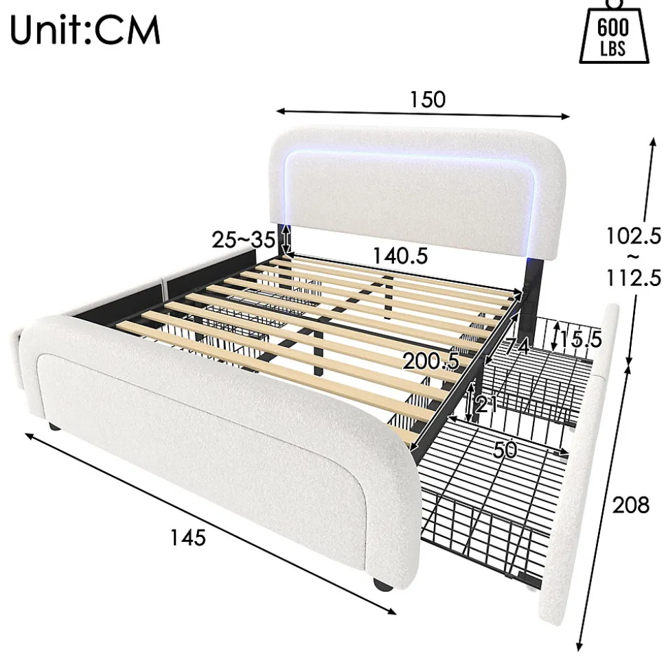 ▶ ▶ Détails ▶────────────────● Nom du produit : Cadre de lit avec fonction de charge USB Type C, éclairage LED et 4 tiroirs● Couleur : Blanc● Matelas applicable (matelas non inclus) : 140 x 200 cm● Dimensions totales : 208 x 150 x 102,5-112,5 cm (L x l x H)● Matériau des panneaux : Sherpa● Poids maximal supporté : 600 LBS (environ 272 kg)● Hauteur du dossier : 25-35 cm● Boxspring requis : Non● Montage nécessaire : Oui● Contenu du colis : Cadre de lit + Fonction de charge USB Type C + Tiroirs● Design unique : Fonction de charge USB Type C● Nombre de colis : 2● Poids brut/net (kg) : 45 / 42,1► Remarques ►※ Ce produit sera livré en 2 colis. Ils peuvent ne pas arriver en même temps. Merci de patienter.※ En raison des mesures manuelles, une erreur de 2-3 cm peut se produire.※ En raison de l’éclairage, des différences de couleur peuvent exister entre l’image du produit et le produit réel. Veuillez vous référer au produit que vous recevez réellement.※ Si vous avez des questions pendant l’installation, n’hésitez pas à nous contacter rapidement.