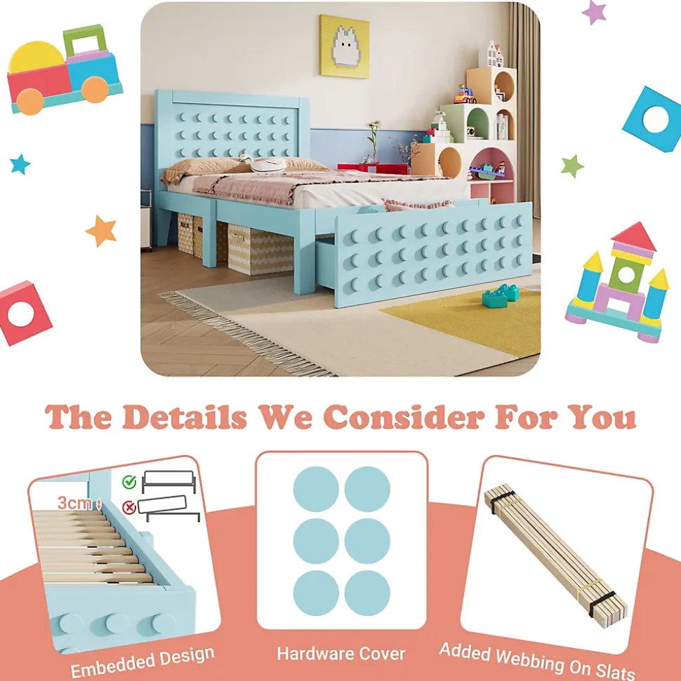 - 【Design Ludique et Original】 La tête et le pied de lit affichent un motif en blocs rectangulaires avec des détails ponctués, apportant une touche créative qui ravira les enfants et éveillera leur imagination.