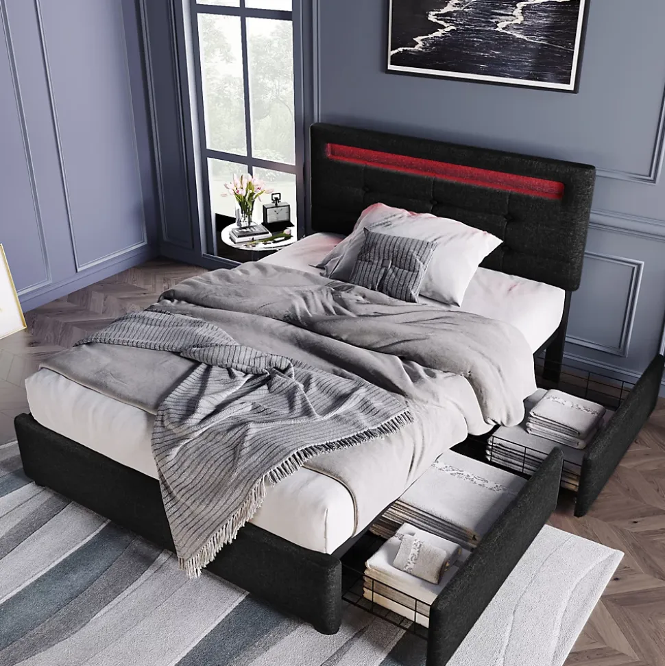 - 【Design élégant et moderne avec éclairage LED】 Ce lit est un mélange parfait de confort et de style. Sa tête de lit, ornementée de boutons décoratifs, ajoute une touche moderne, tandis que l’éclairage LED intégré, contrôlable par télécommande, vous permet d’ajuster la couleur et l’intensité de la lumière pour une ambiance personnalisée.