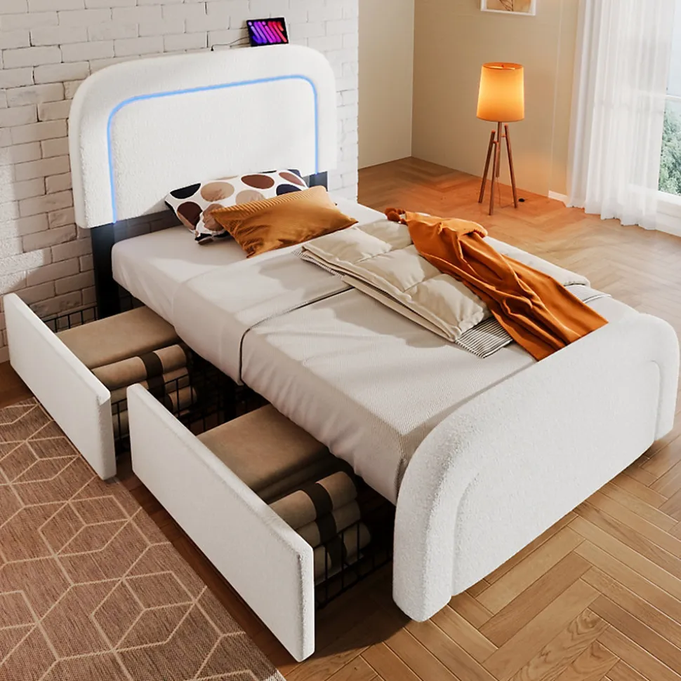 ▶ ▶ Détails ▶────────────────● Nom du produit : Cadre de lit avec fonction de charge USB Type C, éclairage LED et 4 tiroirs● Couleur : Blanc● Matelas applicable (matelas non inclus) : 90 x 200 cm● Dimensions totales : 208 x 100 x 102,5-112,5 cm (L x l x H)● Matériau des panneaux : Sherpa● Poids maximal supporté : 300 LBS (environ 136 kg)● Hauteur du dossier : 25-35 cm● Boxspring requis : Non● Montage nécessaire : Oui● Contenu du colis : Cadre de lit + Fonction de charge USB Type C + Tiroirs● Design unique : Fonction de charge USB Type C● Nombre de colis : 2● Poids brut/net (kg) : 34,7 / 31,5► Remarques ►※ Ce produit sera livré en 2 colis. Ils peuvent ne pas arriver en même temps. Merci de patienter.※ En raison des mesures manuelles, une erreur de 2-3 cm peut se produire.※ En raison de l’éclairage, des différences de couleur peuvent exister entre l’image du produit et le produit réel. Veuillez vous référer au produit que vous recevez réellement.※ Si vous avez des questions pendant l’installation, n’hésitez pas à nous contacter rapidement.