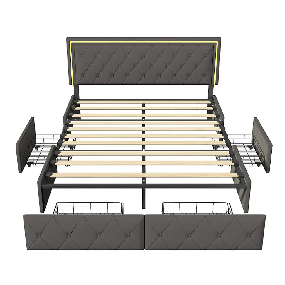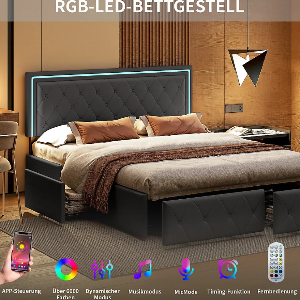 Lit avec rangement: le lit est conçu avec quatre tiroirs spacieux, parfaits pour ranger les vêtements et les draps. C’est la solution parfaite pour optimiser l’espace d’un petit appartement ou d’un studio. La tête de lit avec bande lumineuse LED peut vous fournir un éclairage chaleureux la nuit.Détails de la taille: lit avec rangement est disponible en deux tailles: 140x200cm, 160x200cm, la couleur est également disponible en deux tailles: blanc et gris, s’il vous plaît choisir la bonne taille et la couleur que vous voulez. Veuillez vous référer aux détails de l’image pour des détails spécifiques.Matériaux de haute qualité: lit double avec base en bois massif et lattes métalliques, cuir extérieur et rembourrage intérieur en Mousse éponge pour un soutien solide et un confort de sommeil optimal. Le matériau doux du lit offre non seulement une sensation de confort, mais réduit également efficacement les dommages causés par les coins et les bords tranchants que vous ou votre famille pouvez rencontrer lors de l’utilisation.Construction métallique robuste: la base à lattes supporte 500 kg grâce à un cadre métallique robuste. Lattes métalliques pour répartir uniformément le poids et 4 pieds intermédiaires pour un support central solide pour une stabilité accrue.Installation efficace: afin de réduire les risques de dommages, ce cadre de lit est expédié en 2 cartons et peut arriver à des dates différentes. Ne vous inquiétez pas, les instructions claires et complètes fournies par le colis, toute question s’il vous plaît n’hésitez pas à nous contacter.Couleur:GrisDimensions du produit (L x l x h):208 x 145 x 100 cm; 27 kilogrammesPoids de l’article:27 Kilograms