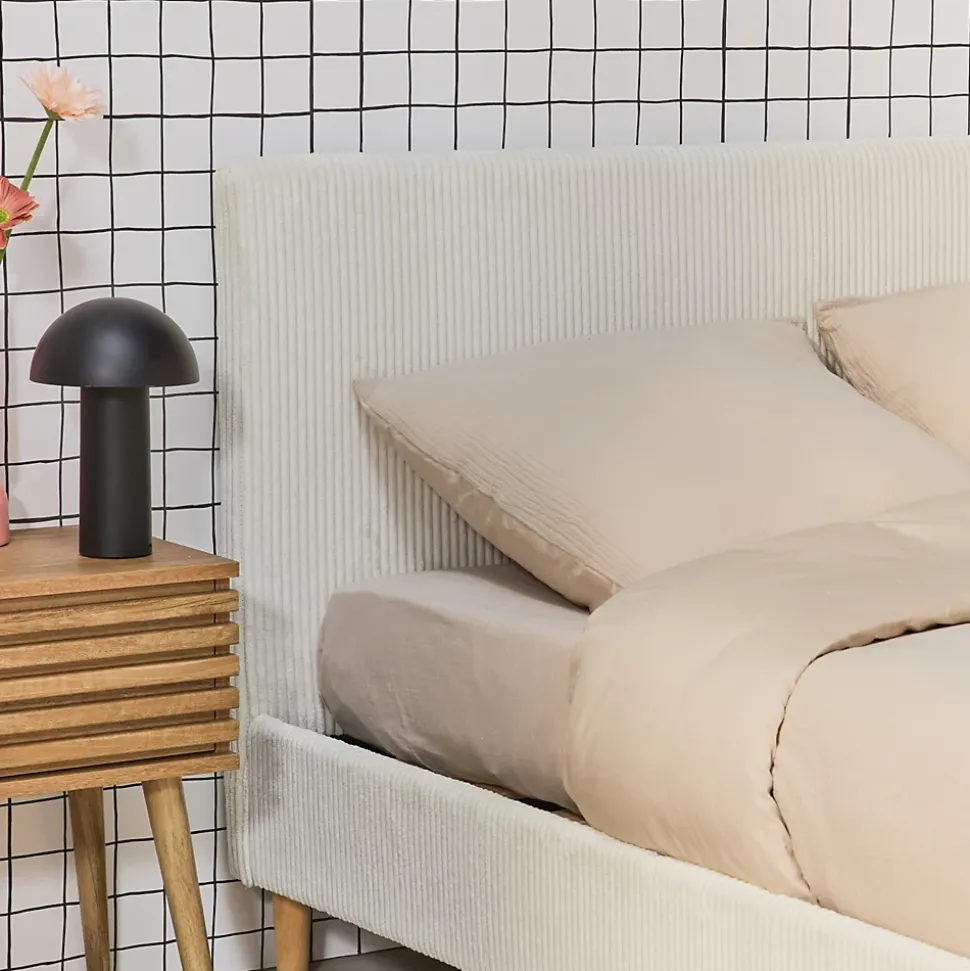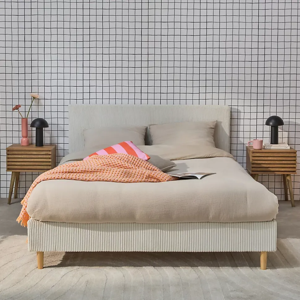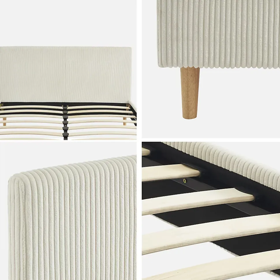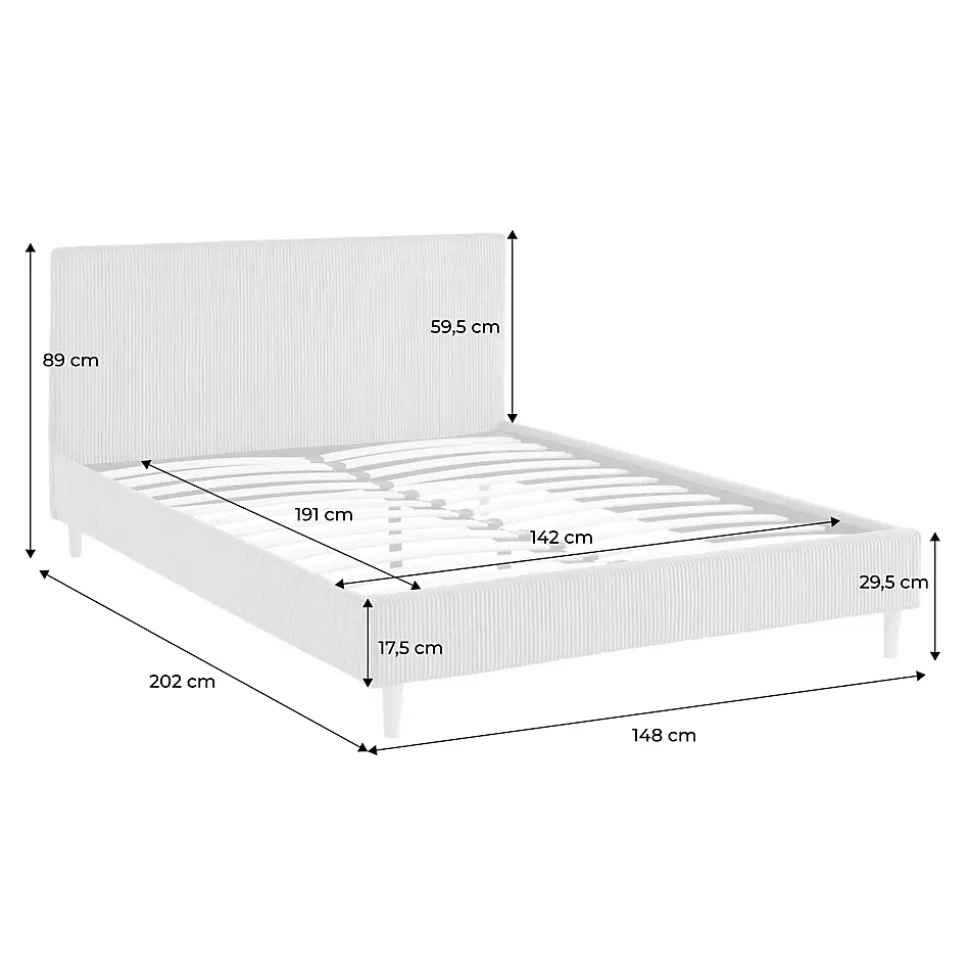 Les + produit :Robuste et durableTête de lit confortableSommier à lattes en bois compositeFinition velours côteléLes matériaux choisis pour la conception de notre lit Marlon assurent robustesse et longévité.Le bois d’eucalyptus, connu pour sa résistance, est combiné à des panneaux composites qui apportent une stabilité supplémentaire.Le revêtement en polyester est non seulement durable, mais aussi résistant à l’usure. La tête de lit avec finition en velours côtelé procure un soutien additionnel qui améliore le confort global du lit, la rendant particulièrement agréable.Le lit Marlon s’adapte facilement à différents styles de décoration intérieure, apportant immédiatement une ambiance chaleureuse.Le sommier à lattes en bois composite assure une ventilation optimale du matelas tout en offrant un soutien uniforme. Cela permet de prolonger la durée de vie de votre matelas et à améliorer la qualité de votre sommeil, (et ça, c’est non négligeable !)Informations complémentaires :Existe aussi en d’autres tailles : Simple (90x190cm) / Queen size (160x200cm)Existe aussi en finition tissu.Existe en plusieurs couleurs : gris – blancMatelas non fourni.Produit à monter, notice fournie.Toutes les couleurs représentées à l’écran peuvent être altérées par plusieurs facteurs, mais aussi parfois par la configuration de votre écran, par la lumière et parfois même par l’angle de vision. Pour en savoir plus nous vous invitons alors à vous diriger vers notre service client qui se fera un plaisir de vous renseigner. Attention, les retours produits dû à ces motifs seront à la charge du client.Caractéristiques et dimensions : Nombre de places : 2Dimensions : L 202 x P 148 x H 89cmHauteur d’assise : 29,5cmDimensions sommier : 191 x 142cmDimensions tête de lit : L 148 x P 5 x H 88cmNombre de lattes : 24 (71 x 5,2 x 1,2cm)Nombre de pieds : 4 + 2Dimension des pieds : Ø4,3 x 12cmPoids net : 25kg