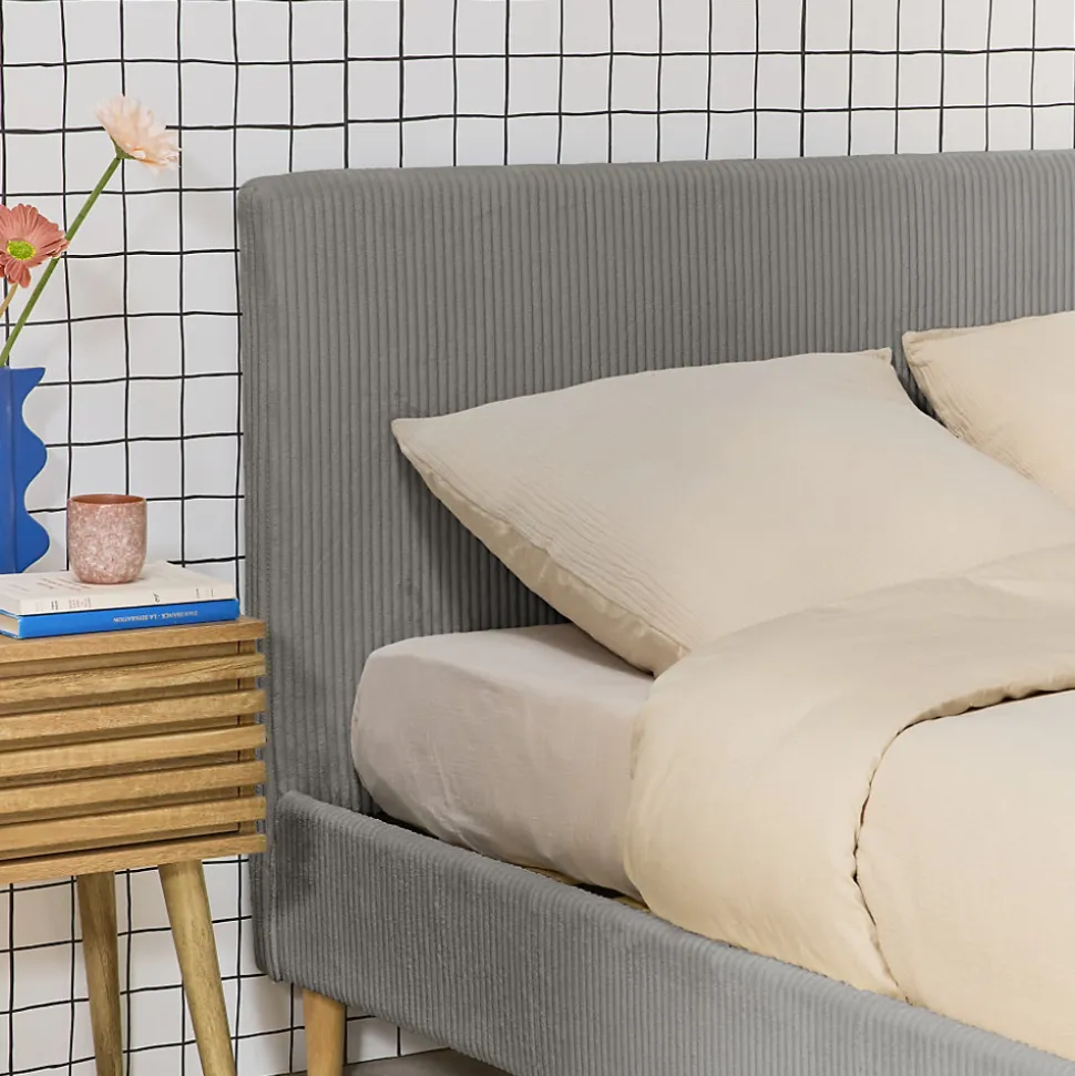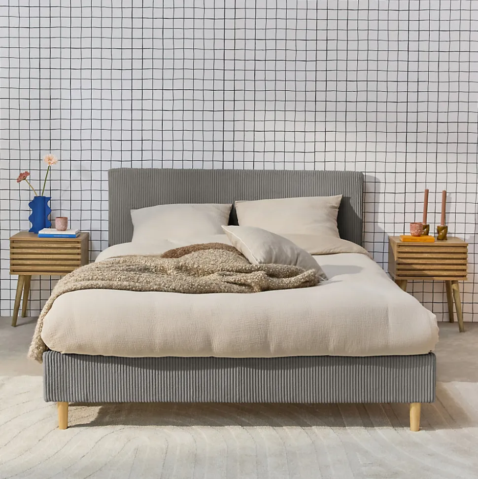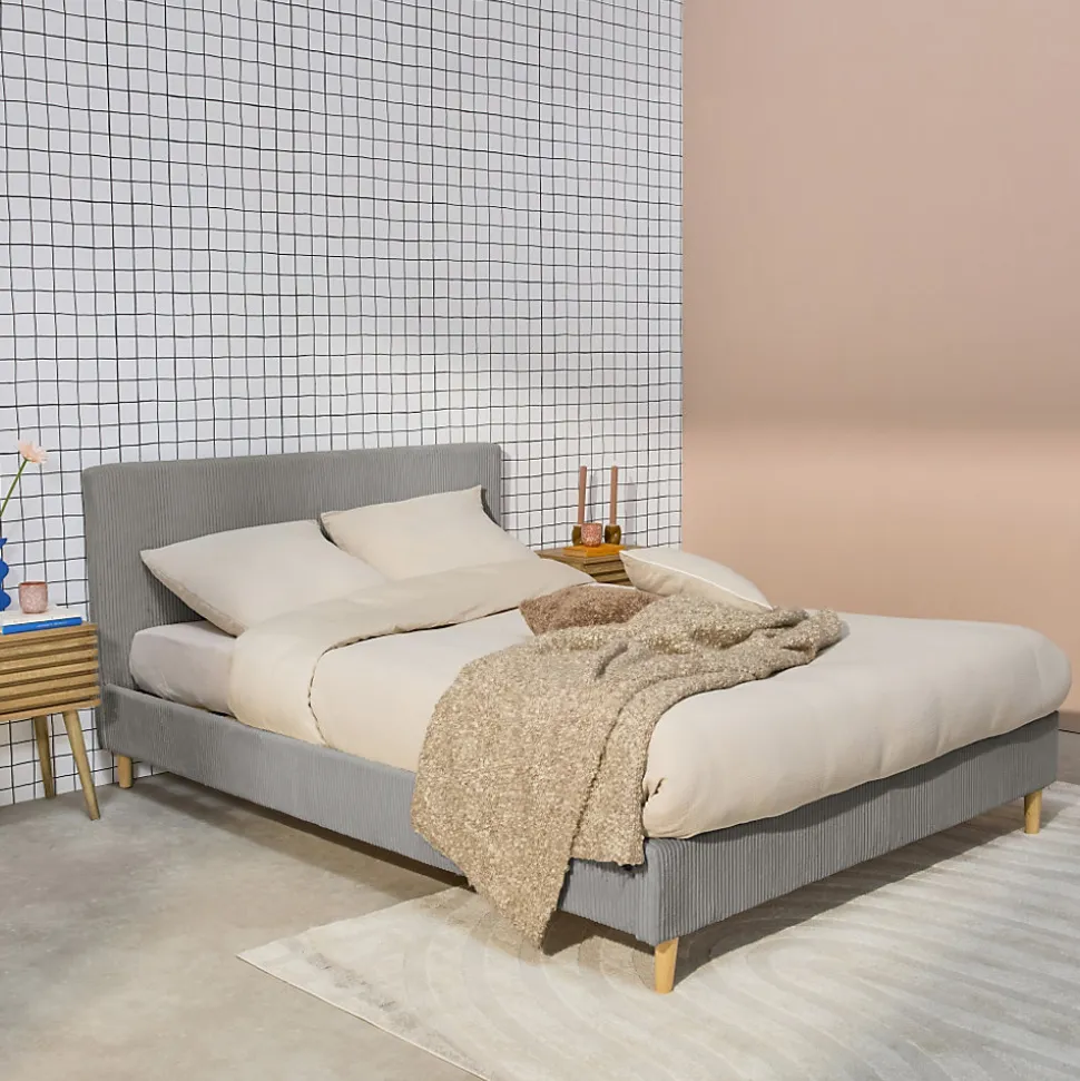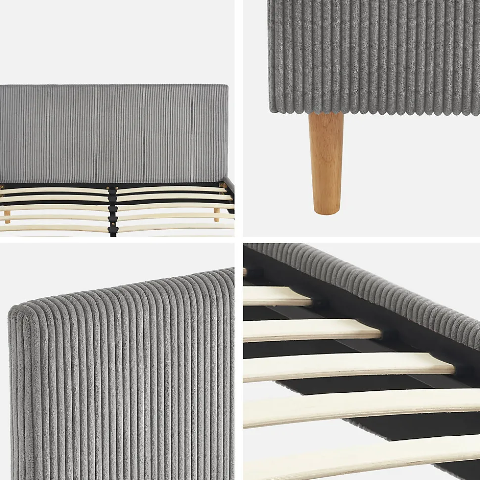 Les + produit :Robuste et durableTête de lit confortableSommier à lattes en bois compositeFinition velours côteléLes matériaux choisis pour la conception de notre lit Marlon assurent robustesse et longévité.Le bois d’eucalyptus, connu pour sa résistance, est combiné à des panneaux composites qui apportent une stabilité supplémentaire.Le revêtement en polyester est non seulement durable, mais aussi résistant à l’usure. La tête de lit avec finition en velours côtelé procure un soutien additionnel qui améliore le confort global du lit, la rendant particulièrement agréable.Le lit Marlon s’adapte facilement à différents styles de décoration intérieure, apportant immédiatement une ambiance chaleureuse.Le sommier à lattes en bois composite assure une ventilation optimale du matelas tout en offrant un soutien uniforme. Cela permet de prolonger la durée de vie de votre matelas et à améliorer la qualité de votre sommeil, (et ça, c’est non négligeable !)Informations complémentaires :Existe aussi en d’autres tailles : Simple (90x190cm) / Queen size (160x200cm)Existe aussi en finition tissu.Existe en plusieurs couleurs : gris – blancMatelas non fourni.Produit à monter, notice fournie.Toutes les couleurs représentées à l’écran peuvent être altérées par plusieurs facteurs, mais aussi parfois par la configuration de votre écran, par la lumière et parfois même par l’angle de vision. Pour en savoir plus nous vous invitons alors à vous diriger vers notre service client qui se fera un plaisir de vous renseigner. Attention, les retours produits dû à ces motifs seront à la charge du client.Caractéristiques et dimensions : Nombre de places : 2Dimensions : L 202 x P 148 x H 89cmHauteur d’assise : 29,5cmDimensions sommier : 191 x 142cmDimensions tête de lit : L 148 x P 5 x H 88cmNombre de lattes : 24 (71 x 5,2 x 1,2cm)Nombre de pieds : 4 + 2Dimension des pieds : Ø4,3 x 12cmPoids net : 25kg