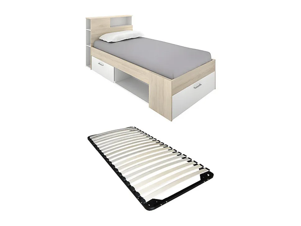 Avec sa tête de lit composée de rangements, ses 2 tiroirs, ses 2 niches latérales et son coffre en bout de lit, le lit LEANDRE allie l’utile à l’agréable en vous permettant de ranger vos livres, votre linge de lit, vos vêtements et bien d’autres choses. 1 x Cadre de lit LEANDRECaractéristiques Couleur (nuance) : Blanc, Naturel clair Matière (précision) : Panneau de particule Finition : Mélaminé Taille (couchage) : 90 x 190 cm Nombre de places : 1 place Réversible Sans matelas Type de rangement : 1 tiroir, 5 niches 1 coffre Tiroir coulissant Produit : Fabriqué en Europe À monter soi-même : 1 coffre de rangement en bout de lit : 1 tête de lit avec 4 niches : 1 niche latérale : Ce lit est compatible avec tous les matelas et les sommiers 90×190 cmDimensions Longueur : 218.5 cm Hauteur : 95 cm Profondeur : 99.5 cm Tiroir : L72.6 x P35 x H15 cm1 x Cadre à lattes KALISTACaractéristiques Couleur (nuance) : Noir Matière (précision) : Métal Epaisseur métal : 1.2 mm Taille (couchage) : 90 x 190 cm Nombre de places : 1 place Sans pieds Technologie (sommier) : Lattes actives Nombre de lattes : 19 lattes Matière des lattes : Bois (peuplier) Charge maximale supportée : 200 kg À monter soi-même : Cadre métal laqué epoxy cintré sur chantDimensions Longueur : 188 cm Hauteur : 5 cm Profondeur : 88 cmLivraisonLors de la livraison, il est conseillé de vérifier que le bon nombre de colis a été livré.Colis1 x Cadre de lit LEANDREColis n°1 : Longueur 199 cm, Largeur 36 cm, Hauteur 7 cm, Poids 26 kg. Colis n°2 : Longueur 115 cm, Largeur 65 cm, Hauteur 10 cm, Poids 37 kg. 1 x Cadre à lattes KALISTAColis n°1 : Longueur 182 cm, Largeur 30 cm, Hauteur 7 cm, Poids 12 kg.