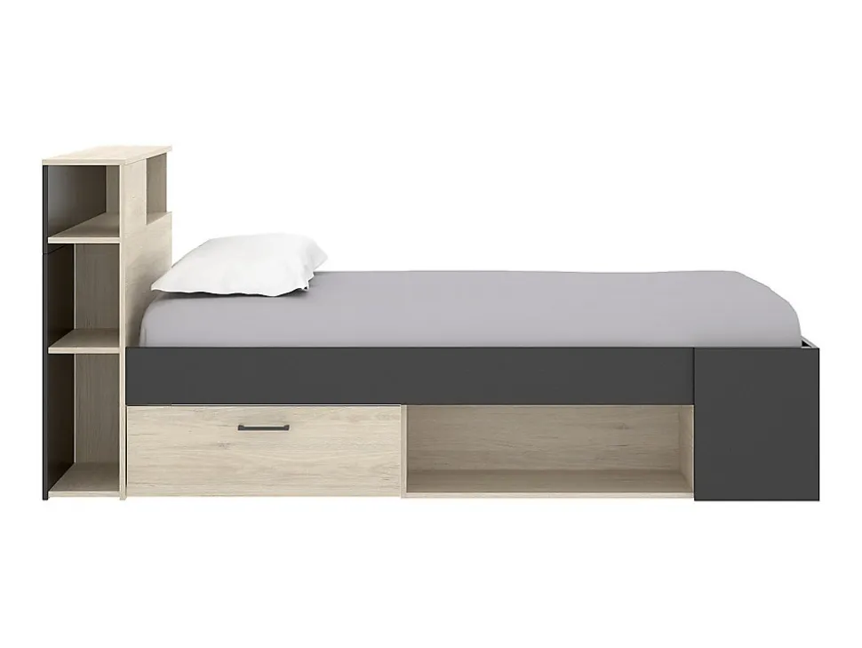- Lit 120 x 190 cm avec tête de lit rangements et tiroirs – Structure : Panneaux de particules – Coloris : Naturel et anthracite – Style : Intemporel – Dimensions : L217,3 x P129,6 x H95 cm + Sommier – LEANDRE répondra à toutes vos attentes !