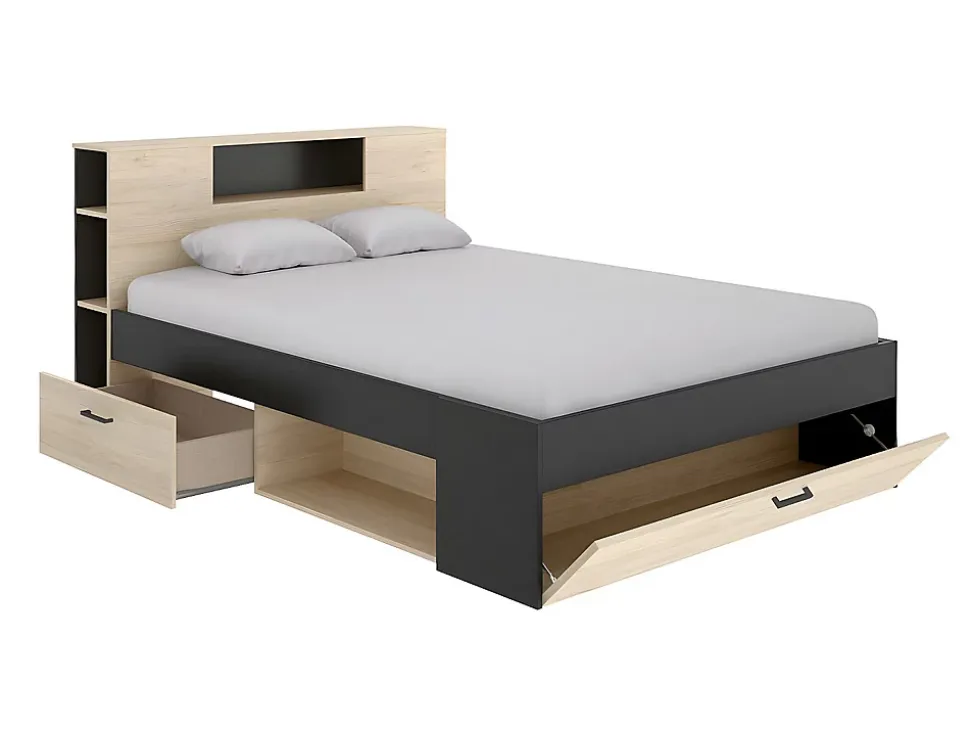 - Lit avec tête de lit rangements et tiroirs LEANDRE – 140 x 190 cm – Coloris : Naturel et anthracite – Matériaux : Panneaux de particules – Rangements : 2 tiroirs, 1 coffre et 9 niches – L218,5 x P149,6 x H95 cm – Style : Intemporel + Sommier + Matelas