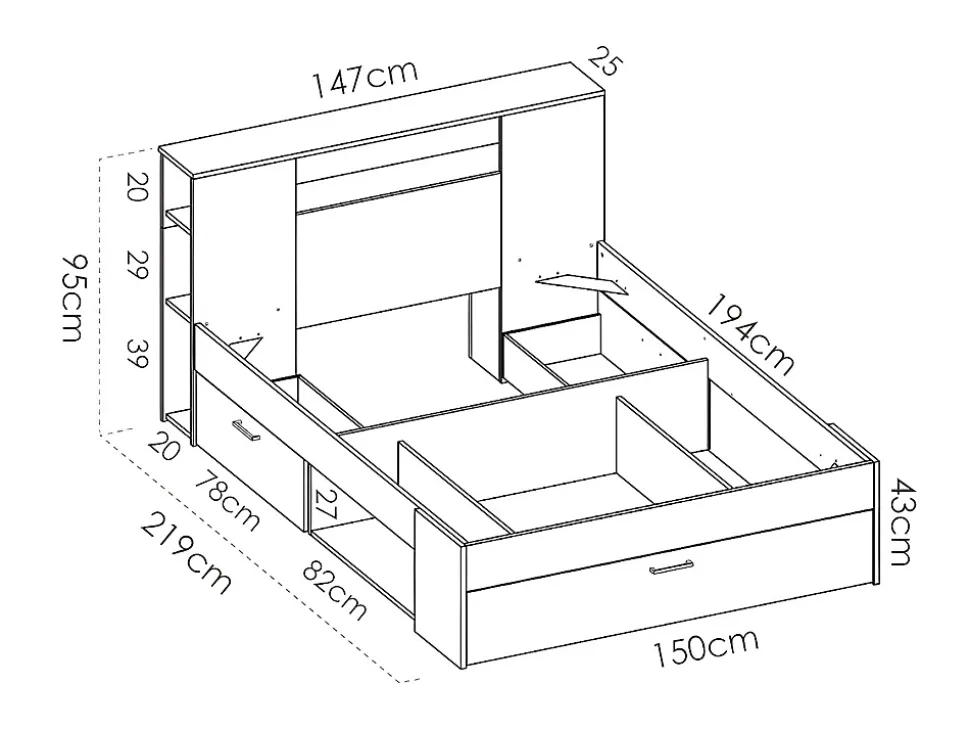 Avec sa tête de lit composée de rangements, ses 2 tiroirs, ses 2 niches latérales et son coffre en bout de lit, le lit LEANDRE allie l’utile à l’agréable en vous permettant de ranger vos livres, votre linge de lit, vos vêtements et bien d’autres choses. 1 x Cadre de lit LEANDRECaractéristiques Couleur (nuance) : Blanc, Naturel clair Matière (précision) : Panneau de particule Finition : Mélaminé Taille (couchage) : 140 x 190 cm Nombre de places : 2 places Réversible Sans matelas Type de rangement : 2 tiroirs, 9 niches 1 coffre Tiroir coulissant , Espace pro Produit : Fabriqué en Europe À monter soi-même Niches latérales : 2 : 1 tête de lit avec 7 niches : 1 coffre de rangement en bout de lit : Ce lit est compatible avec tous les matelas et sommiers 140×190 cmDimensions Longueur : 218.5 cm Hauteur : 95 cm Profondeur : 149.6 cm Tiroirs : L78 x P35 x H15 cm1 x Cadre à lattes KALISTACaractéristiques Couleur (nuance) : Noir Matière (précision) : Métal Epaisseur métal : 1.2 mm Taille (couchage) : 140 x 190 cm Nombre de places : 2 places Sans pieds Technologie (sommier) : Lattes actives Nombre de lattes : 38 lattes Matière des lattes : Bois (peuplier) Charge maximale supportée : 250 kg À monter soi-même : Cadre métal laqué epoxy cintré sur chantDimensions Longueur : 188 cm Hauteur : 5 cm Profondeur : 138 cmLivraisonLors de la livraison, il est conseillé de vérifier que le bon nombre de colis a été livré.Colis1 x Cadre de lit LEANDREColis n°1 : Longueur 198 cm, Largeur 35 cm, Hauteur 9 cm, Poids 29 kg. Colis n°2 : Longueur 154 cm, Largeur 36 cm, Hauteur 12 cm, Poids 30 kg. Colis n°3 : Longueur 116 cm, Largeur 43 cm, Hauteur 14 cm, Poids 33 kg. 1 x Cadre à lattes KALISTAColis n°1 : Longueur 193 cm, Largeur 33 cm, Hauteur 7 cm, Poids 18 kg.