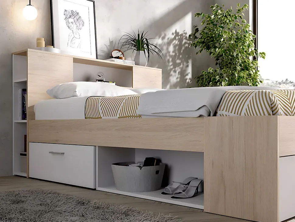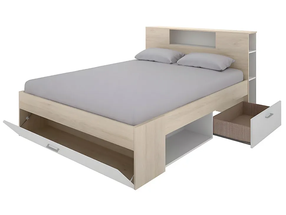 - Lit avec tête de lit rangements et tiroirs LEANDRE – 140 x 190 cm – Coloris : Naturel et blanc – Matériaux : Panneaux de particules – Rangements : 2 tiroirs, 1 coffre et 9 niches – Dim : L218,5 x P149,6 x H95 cm – Style : Intemporel+ Sommier
