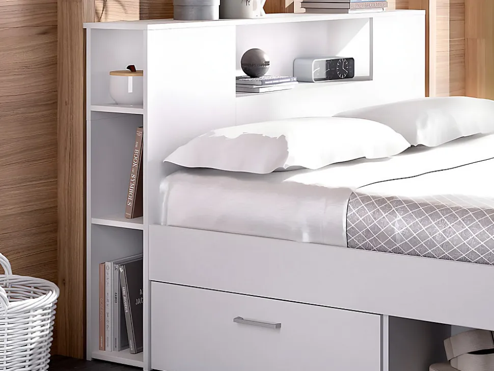 - Lit avec tête de lit rangements et tiroirs LEANDRE – 160 x 200 cm – Coloris : Blanc – Matériaux : Panneaux de particules – Rangements : 2 tiroirs, 1 coffre et 9 niches – Dim : L228,5 x P169,5 x H95 cm – Style : Intemporel+ Sommier + Matelas