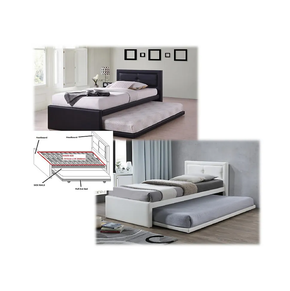 Lit avec tiroir-lit RODAN – 90×200 cm – Similicuir blanc – Sommier inclusLe lit RODAN est un choix idéal pour ceux qui recherchent un meuble fonctionnel et élégant. Son revêtement en similicuir blanc lui confère un aspect raffiné et moderne, parfait pour une chambre lumineuse et contemporaine. Doté d’un tiroir-lit intégré, il offre un couchage supplémentaire discret et pratique. Son sommier à 12 lattes garantit un excellent soutien et un confort optimal.Caractéristiques du produit :Type de produit : Lit avec tiroir-litCollection : RODANDimensions : L221 cm x P102 cm x H120 cmDimensions tiroir-lit : L197 cm x P90,5 cm x H8,5 cmMatériau : Similicuir et structure robusteColoris : Blanc (existe également en noir)Type de sommier : Sommier inclus (12 lattes)Matelas : Non inclusAvantages du lit RODAN :Design élégant : Son revêtement en similicuir blanc apporte une touche chic et moderne à votre chambre.Fonctionnalité : Son tiroir-lit intégré permet un couchage d’appoint pratique pour optimiser l’espace.Confort et robustesse : Son sommier à lattes assure un excellent maintien pour un sommeil réparateur.Pourquoi choisir le lit RODAN ?Esthétique et praticité : Un design élégant combiné à une solution de couchage modulable.Facilité d’entretien : Le revêtement en similicuir est résistant et simple à nettoyer.