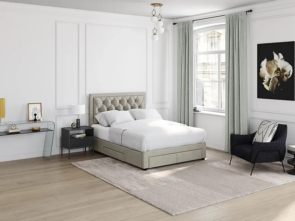 De la praticité, sans sacrifier l’esthétique et le charme avec ce lit capitonné en tissu avec 4 tiroirs ! Caractéristiques Couleur (nuance) : Beige Matière (précision) : 100 % Polyester, Velours Matière (Piètement) : Bois Structure : Bois, Panneau de particules, MDF Finition : Capitonné Taille (couchage) : 140 x 190 cm Nombre de places : 2 places Sans matelas Avec sommier Type de sommier : Cadre à lattes Type de rangement : 4 tiroirs Tiroir coulissant Gamme : Good for Planet, Espace pro Produit : Piétement PEFC, Lattes issues de forêts gérées durablement Charge maximale supportée : 200 kg À monter soi-même Finition : Tissu velours : Tête de lit damassée : 2 tiroirs de rangement latéraux : 2 tiroirs de rangement frontaux : Sommier 14 lattes inclus : Ce lit est compatible avec tous les matelas 140×190 cmDimensions Longueur : 206.5 cm Hauteur : 122.2 cm Profondeur : 145 cm Hauteur de couchage : 39 cm Tiroirs frontaux : 61 x 18 x 53 cm Tiroirs latéraux : 80 x 14 x 53 cmLivraisonLors de la livraison, il est conseillé de vérifier que le bon nombre de colis a été livré.ColisColis n°1 : Longueur 151 cm, Largeur 126 cm, Hauteur 14 cm, Poids 27 kg. Colis n°2 : Longueur 151 cm, Largeur 43 cm, Hauteur 11 cm, Poids 14 kg. Colis n°3 : Longueur 196 cm, Largeur 37 cm, Hauteur 10 cm, Poids 18 kg. Colis n°4 : Longueur 100 cm, Largeur 55 cm, Hauteur 9 cm, Poids 17 kg. Colis n°5 : Longueur 145 cm, Largeur 32 cm, Hauteur 9 cm, Poids 20 kg. Colis n°6 : Longueur 144 cm, Largeur 18 cm, Hauteur 11 cm, Poids 9 kg.