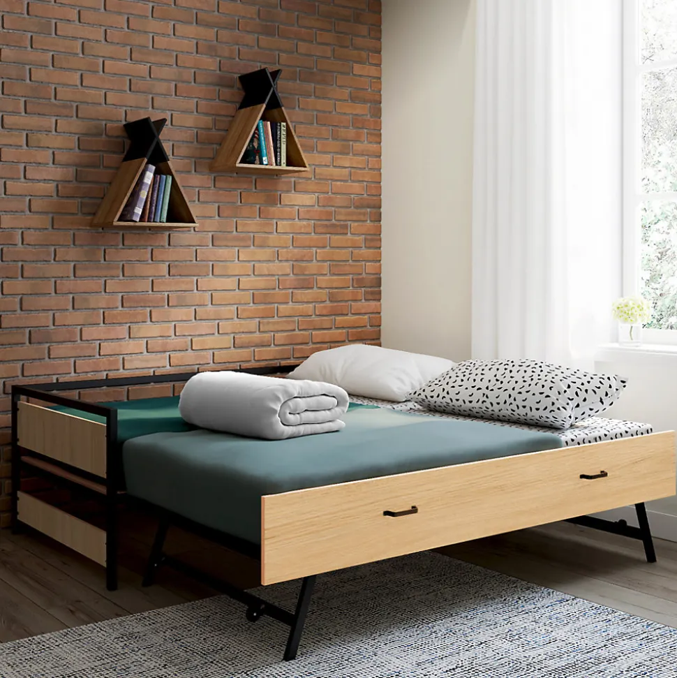 À la recherche d’une banquette convertible, à la fois esthétique et pratique ? Optez pour le lit gigogne DETROIT de 90 x 190 cm au coloris bois et noir. Ce lit gigogne au style industriel et aux lignes épurées ne manquera pas d’apporter du caractère à votre intérieur, tout en offrant un couchage supplémentaire, grâce à son option gigogne. Couchage 2 en 1, cette banquette convertible est idéale pour une chambre d’amis, un appartement étudiant ou même dans votre salon en guise de banquette, en la plaçant contre un mur avec quelques coussins.Grâce à cette banquette convertible, vous pouvez optimiser l’agencement de la pièce : un lit 2 places une fois déplié et un lit indépendant ou banquette lorsque vous le repliez. Une solution gain de place qui ne risque pas d’envahir les petits espaces ! Le sommier du couchage principal se compose de 13 lattes et le sommier du couchage secondaire, 11 lattes. Pour déplier votre couchage, c’est très simple, il vous suffit de tirer sur le sommier du second couchage grâce à son système de roulettes et de déplier ses pieds. Vous bénéficiez ainsi d’un véritable lit double à compléter d’un matelas. Alors n’hésitez plus et craquez pour le lit gigogne DETROIT, la solution idéale pour optimiser l’espace de votre pièce !Matelas non vendu avec la banquette convertible.La banquette peut accueillir un matelas jusqu’à 25 cm d’épaisseur. Dimensions du lit gigogne DETROIT 90 x 190 cmDimensions globales du lit plié : Longueur 201 cm x largeur 95.5 cm x Hauteur 61 cmDimensions intérieures du lit principal : L. 195 x l. 92.5 cmCouchage lit plié : 90 x 190 cmDimensions globales du lit déplié : L.201 cm x l.184 cm x H.61 cmCouchage lit déplié : 180 x 190 cmHauteur des pieds : 29.5 cmDimension poignée : 9.5 cmNombre de lattes : 13Distance entre chaque latte : 10 cmÉpaisseur des lattes : 1.5 cmÉpaisseur bois rebords : 1.5 cmHauteur sommier : 31 cmDimensions banquette : L. 192.5 x l. 88.5 cm – 4 roulettesNombre de latte banquette : 11Matériaux : Particules