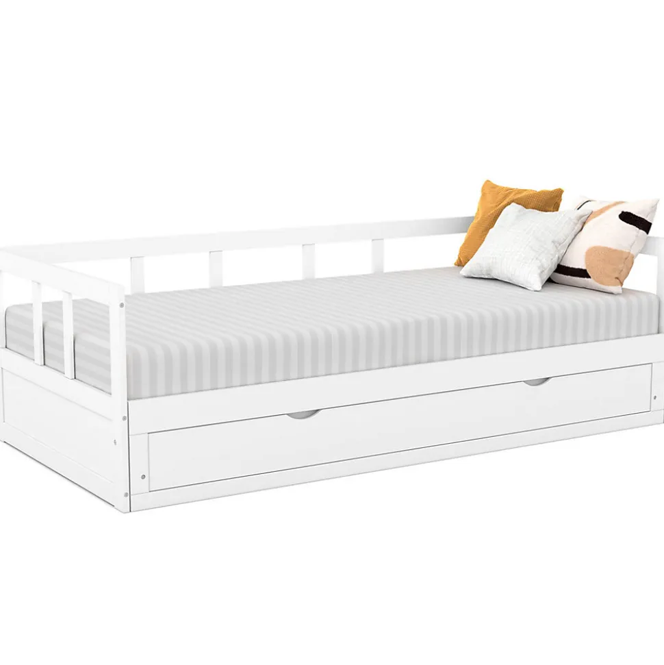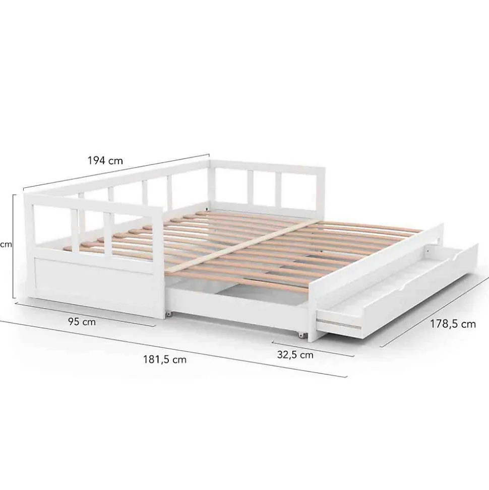 Craquez pour le lit gigogne ZOYA et profitez d’un couchage à la fois pratique et gain de place pour aménager votre bureau, une chambre d’amis ou encore un appartement étudiant !Ce lit est le parfait compromis entre optimisation de l’espace et confort de couchage, grâce à sa banquette coulissante.En effet, lorsqu’elle est pliée, cette banquette 90×190 cm prend peu de place : elle peut être utilisée aussi bien en lit 1 place qu’en canapé !Dépliez la banquette en coulissant simplement la façade vers vous et profitez ainsi d’un grand et confortable lit 2 places de 180×190 cm ! Ce lit gigogne est donc l’allié parfait lorsqu’on souhaite pouvoir accueillir ponctuellement du monde à dormir sans pour autant encombrer quotidiennement la pièce dans lequel il se trouve.Cette banquette convertible est également idéale dans un appartement étudiant car elle peut servir à la fois de canapé et de lit, pratique lorsqu’on vit dans un petit espace.Ce lit gigogne ZOYA comprend également un grand tiroir en façade de 178.5 x 32 cm ! Vous pourrez ainsi y ranger aussi bien du linge de lit ou de maison que des affaires personnelles pour les conserver à portée de main.Le design blanc et épuré de ce lit d’appoint s’intègrera parfaitement dans tous types de décoration intérieure pour un espace de vie à la fois sobre et moderne ! Lit vendu sans matelas. A compléter avec 2 matelas 1 place de 90×190 cm.Dimensions du lit banquette gigogne ZOYA Dimensions globales plié : Longueur 194 x largeur 95 x Hauteur 60 cm Dimensions globales déplié : Longueur 194 x largeur 181.5 x Hauteur 60 cm Dimension intérieur du tiroir : 178.5 x 32.5 cm Nombre de lattes : 23 Distance entre les lattes : 2.5 cm Largeur des lattes : 6 cm Épaisseur des lattes : 1.2 cm Épaisseur structure / rebord : 1.8 cm Hauteur barreau : 30 cm Hauteur sommier : 23.5 cm Matériaux : MDF Coloris : blanc À monter soi-mêmeRetrouvez l’ensemble de nos lits sur notre boutique en ligne !